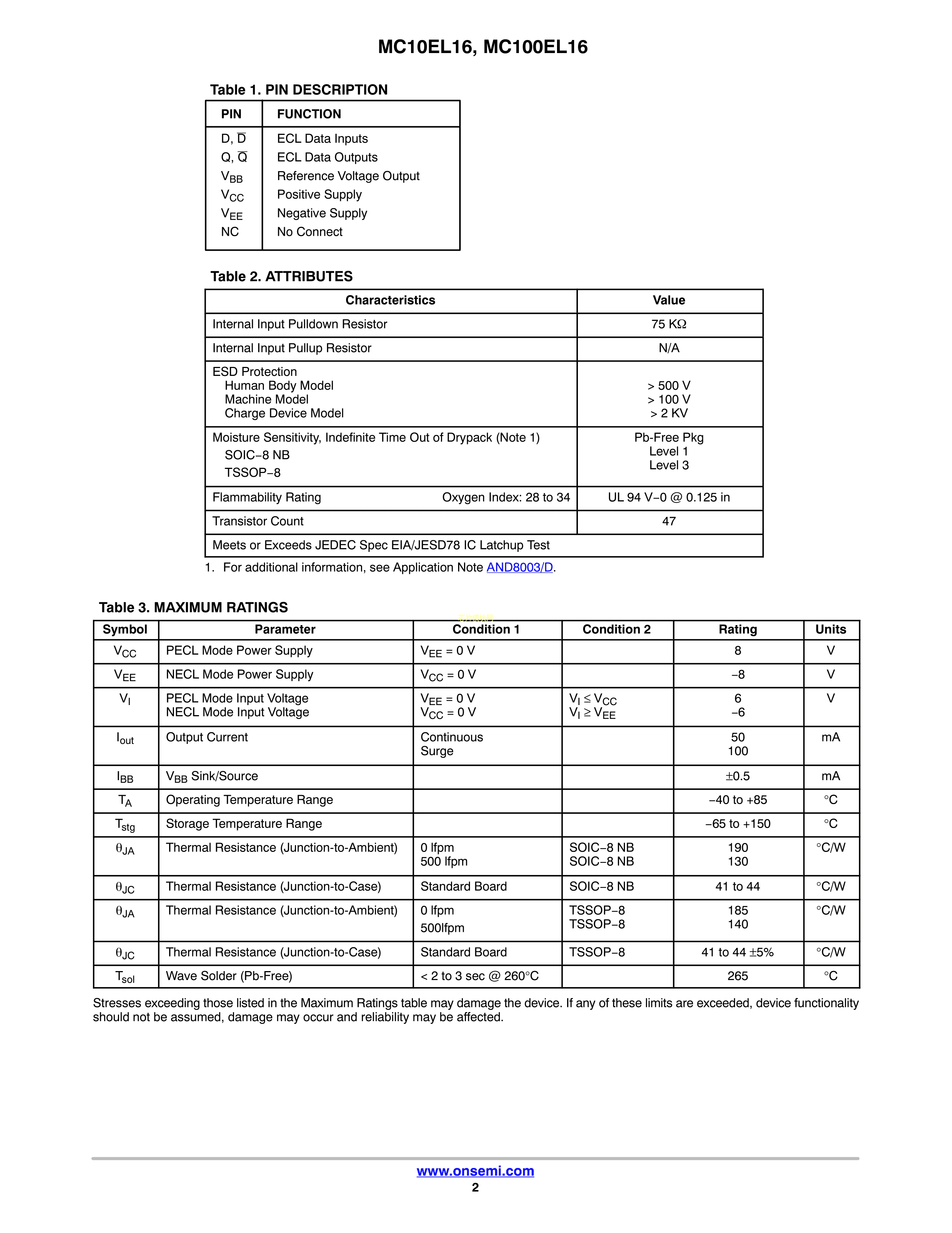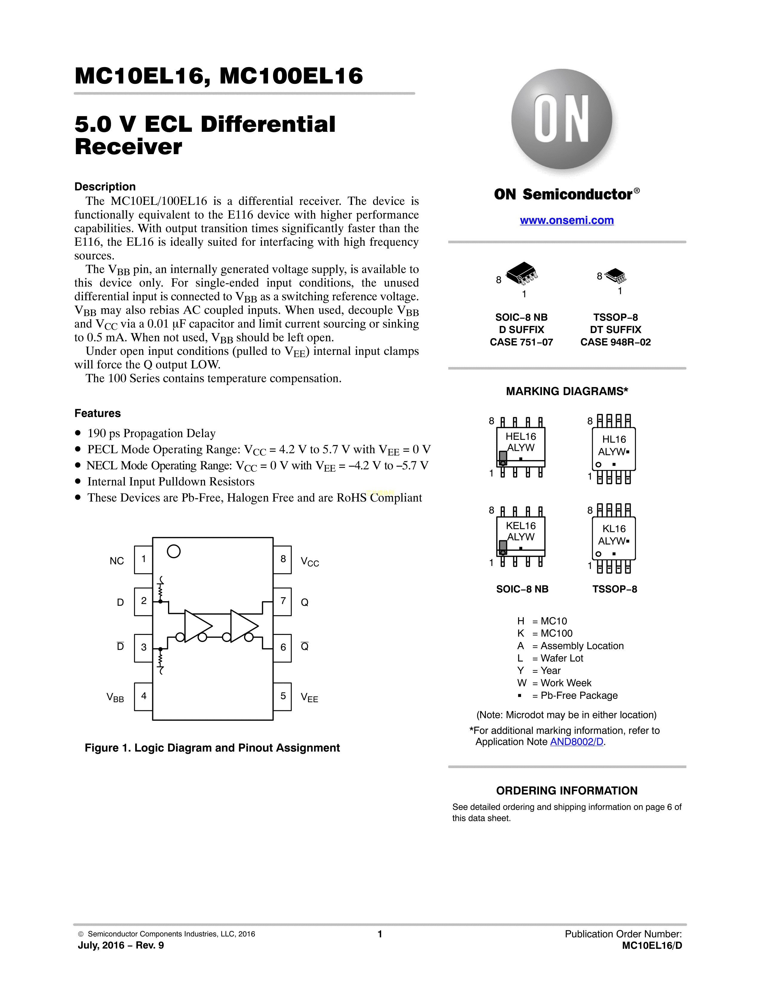 MC100EL16DG数据手册SOIC-8_150mil封装onsemi(安森美)PDF规格书,中英
