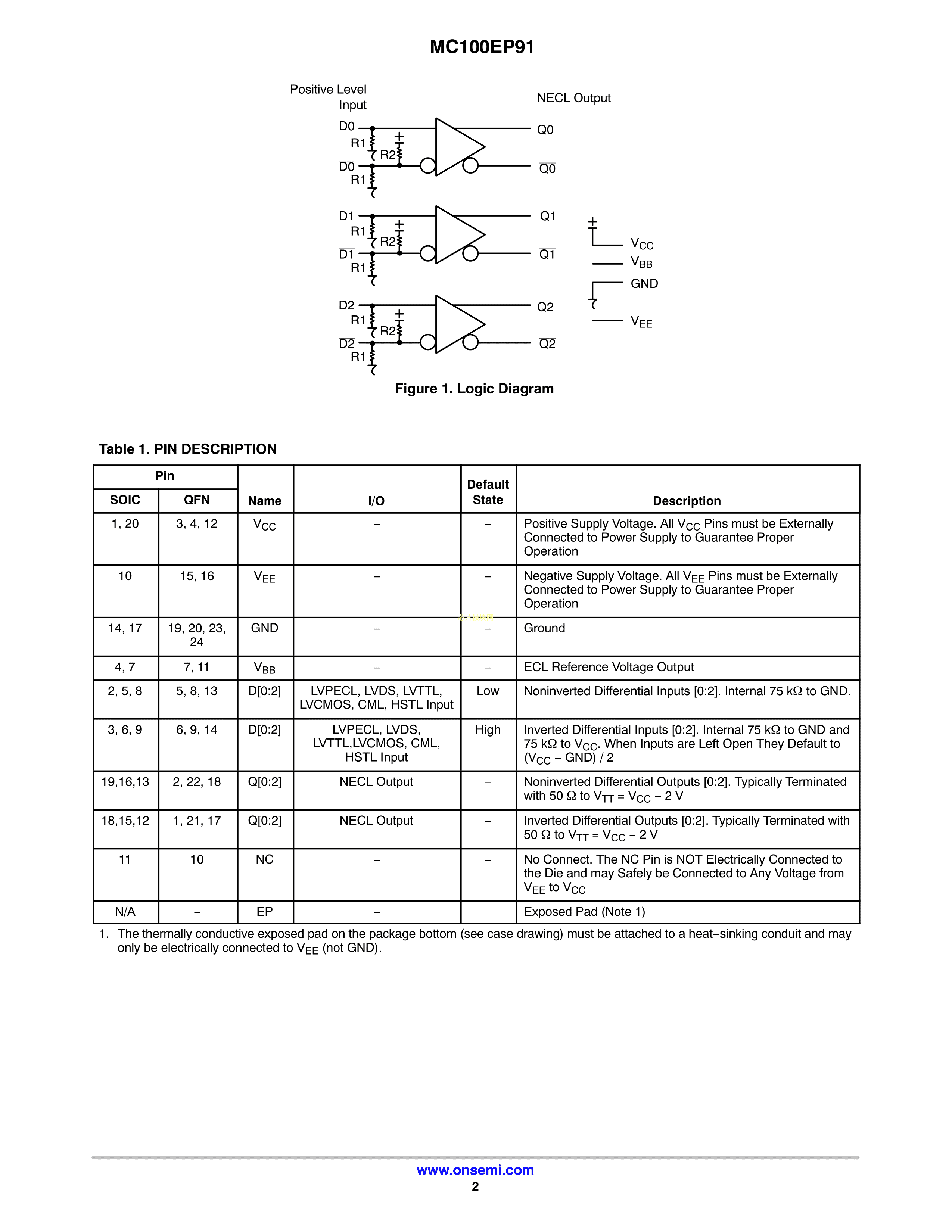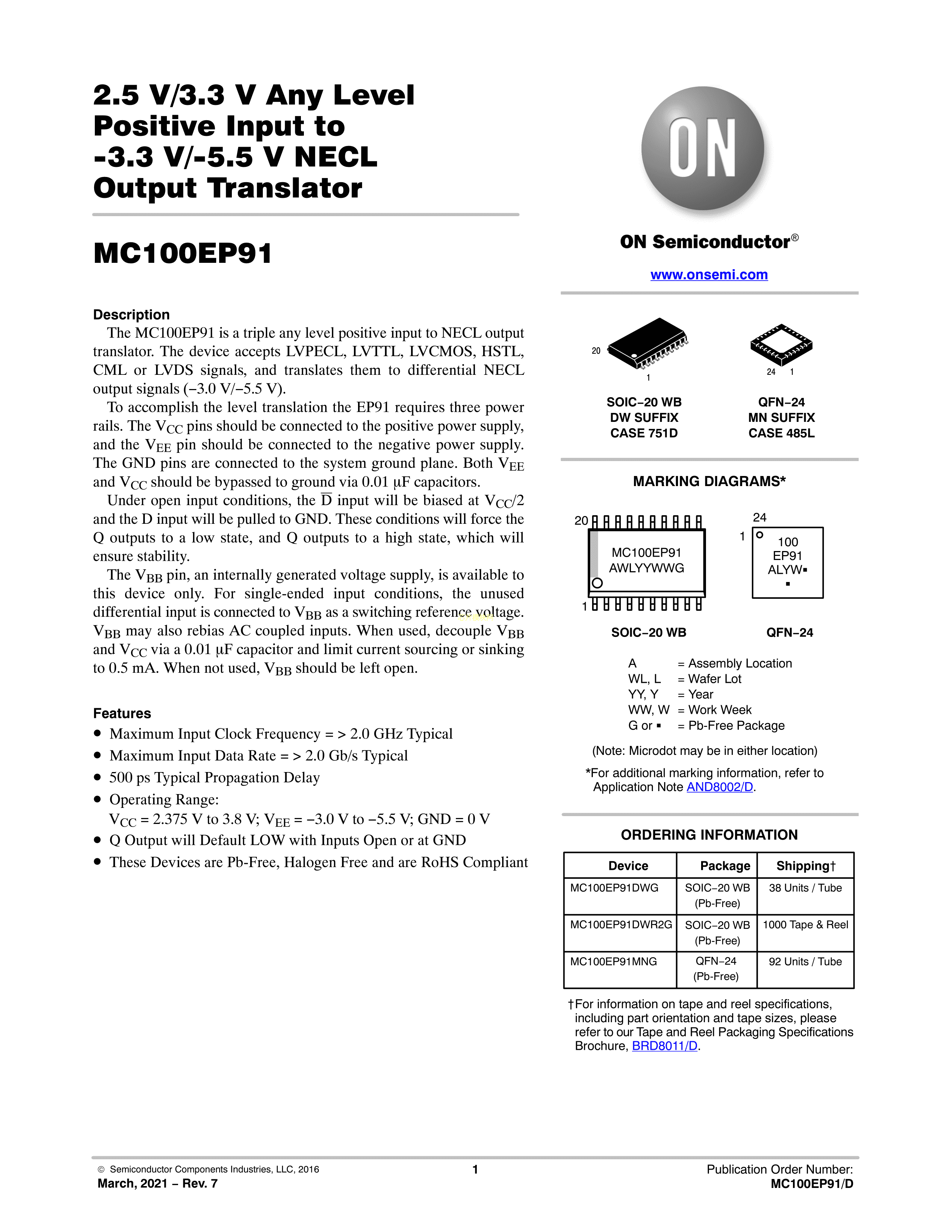 MC100EP91DWR2G数据手册SOIC-20封装onsemi(安森美)PDF规格书,中英文下载