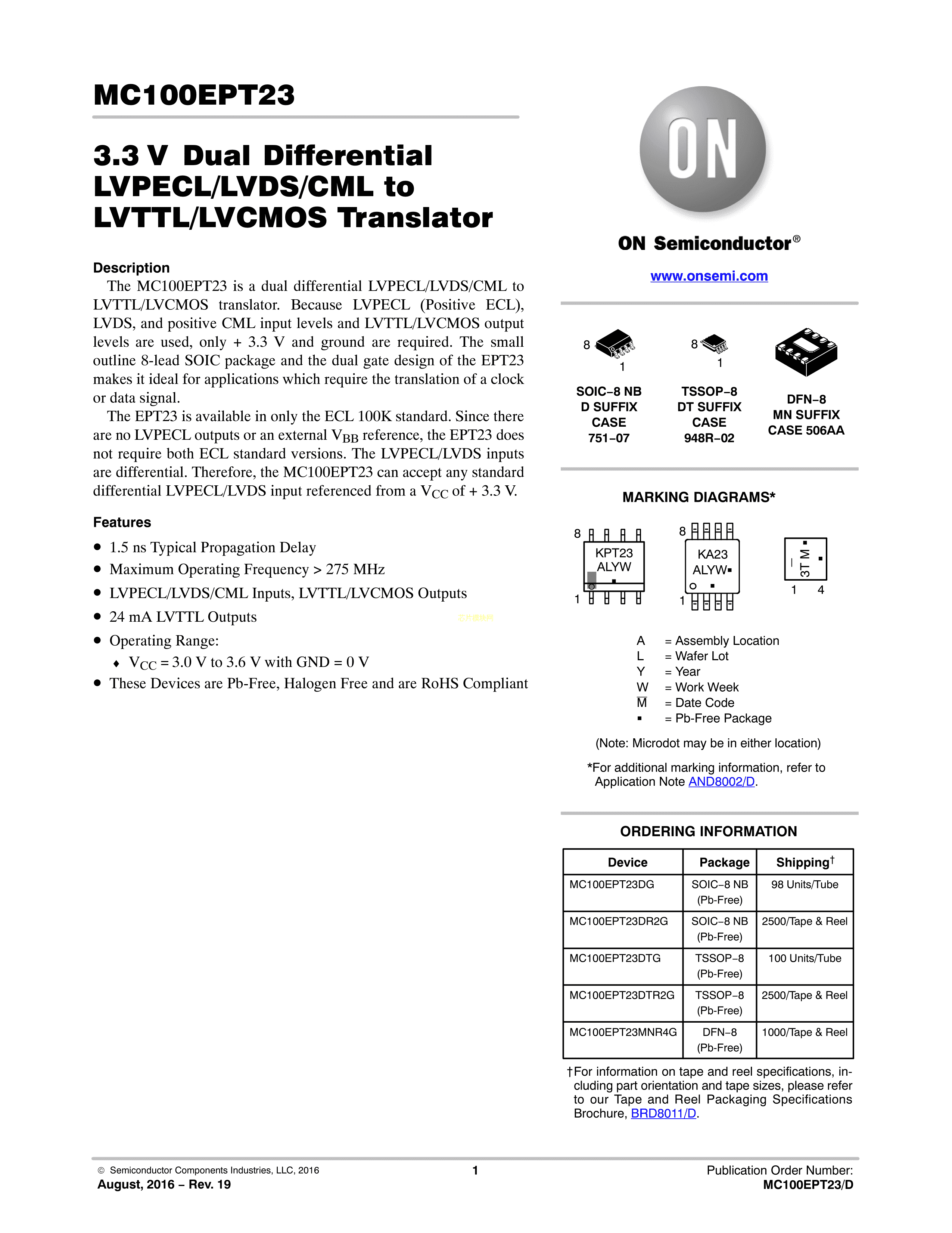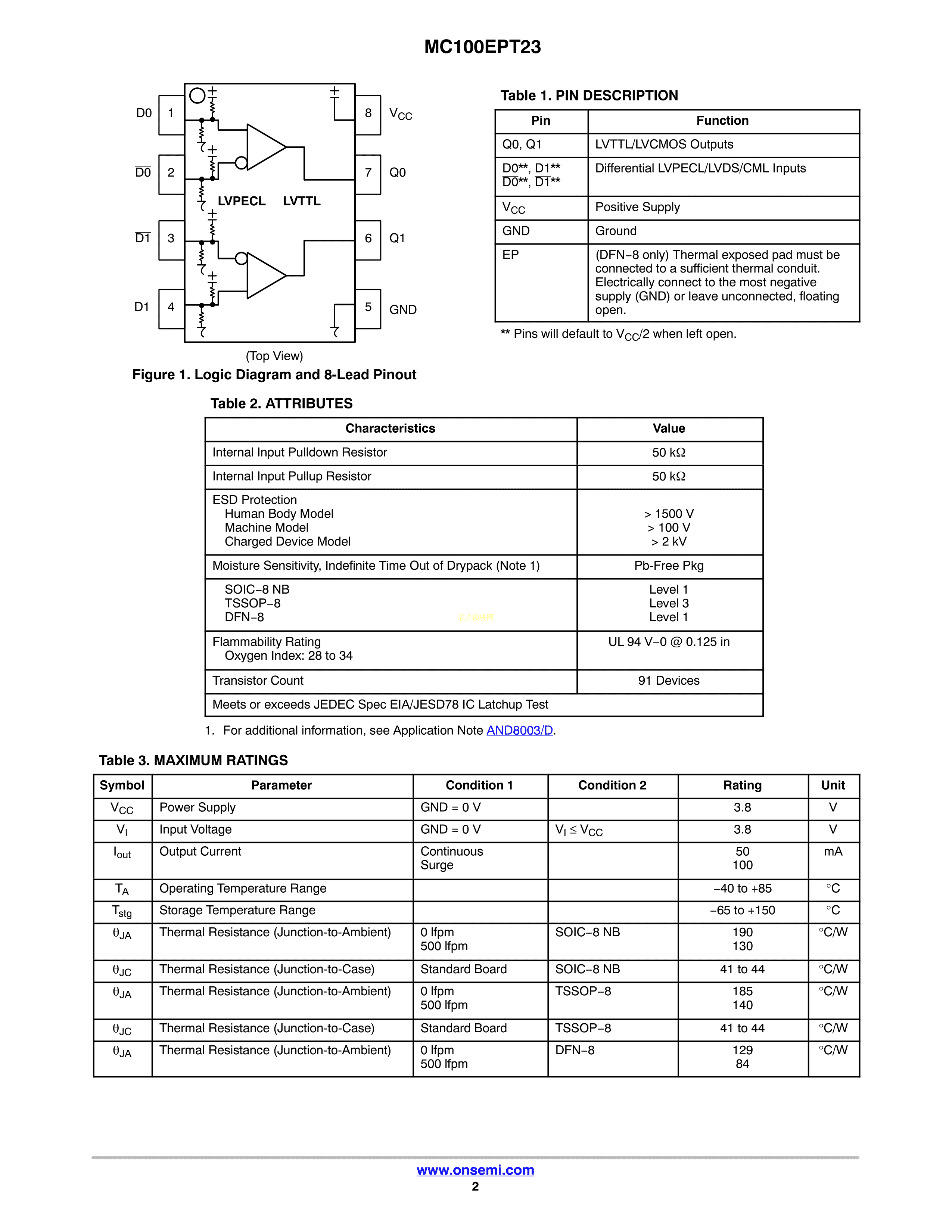 MC100EPT23MNR4G数据手册DFN-8封装onsemi(安森美)PDF规格书,中英文下载