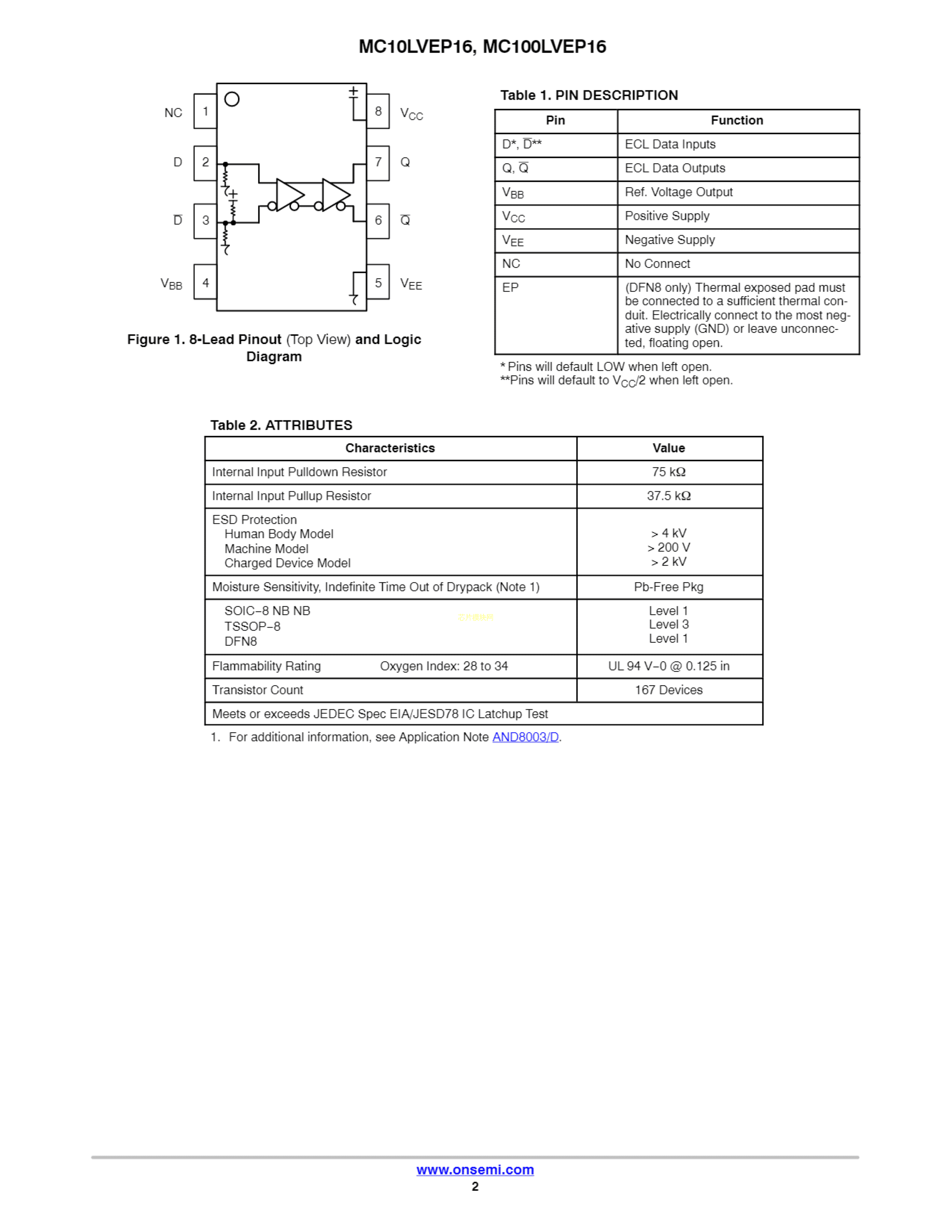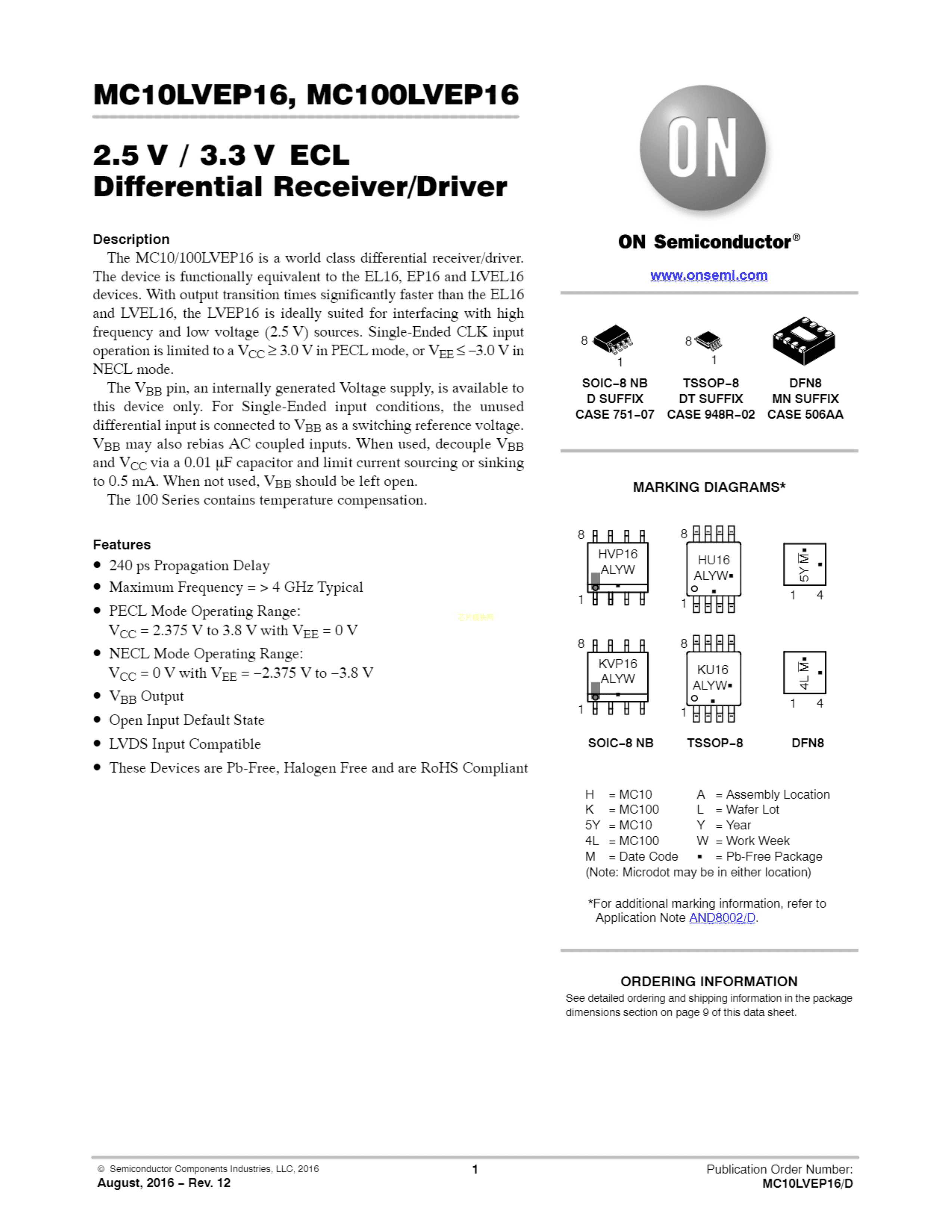MC100LVEP16DR2G数据手册SOIC-8NB封装onsemi(安森美)PDF规格书,中英文