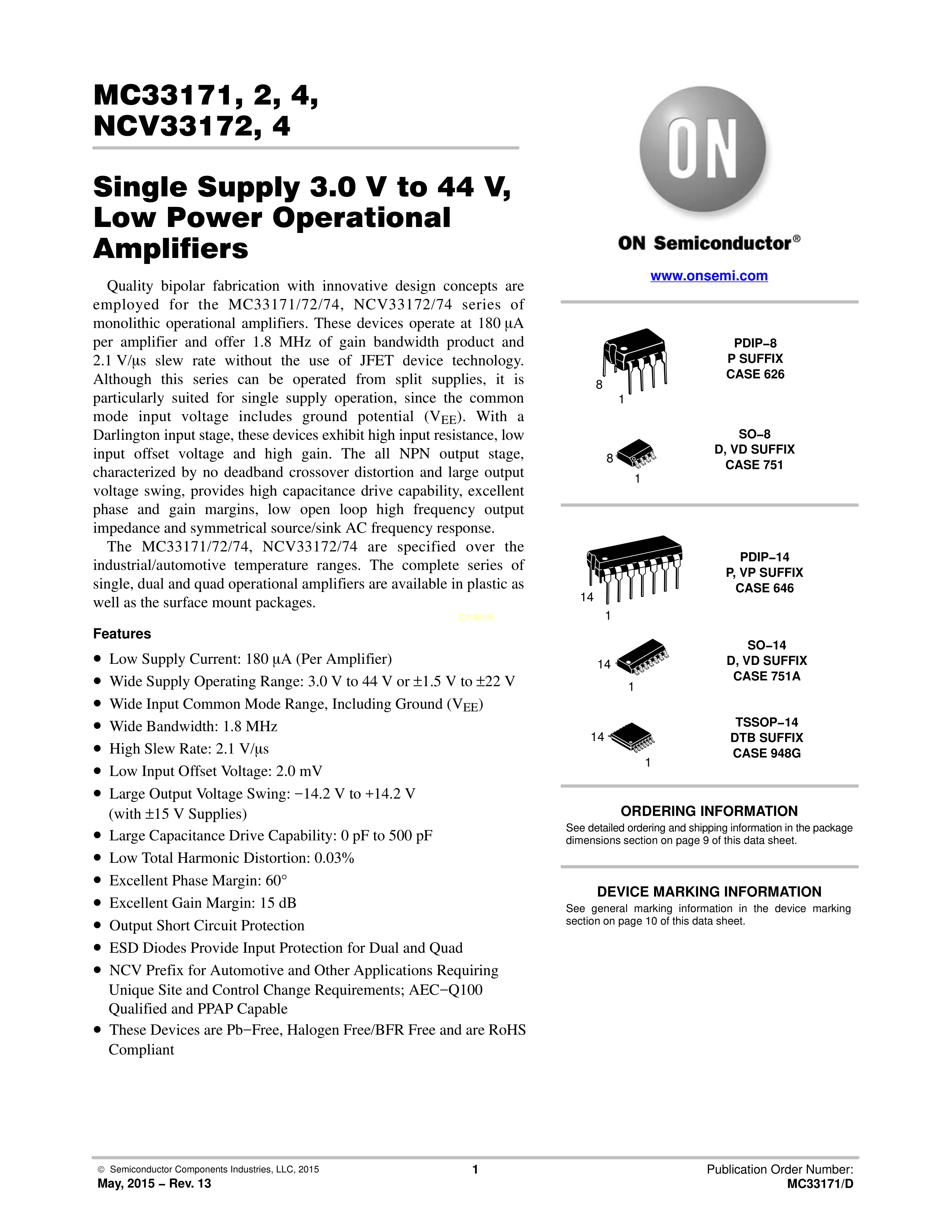 MC33172VDR2G数据手册SO-8封装onsemi(安森美)PDF规格书,中英文下载