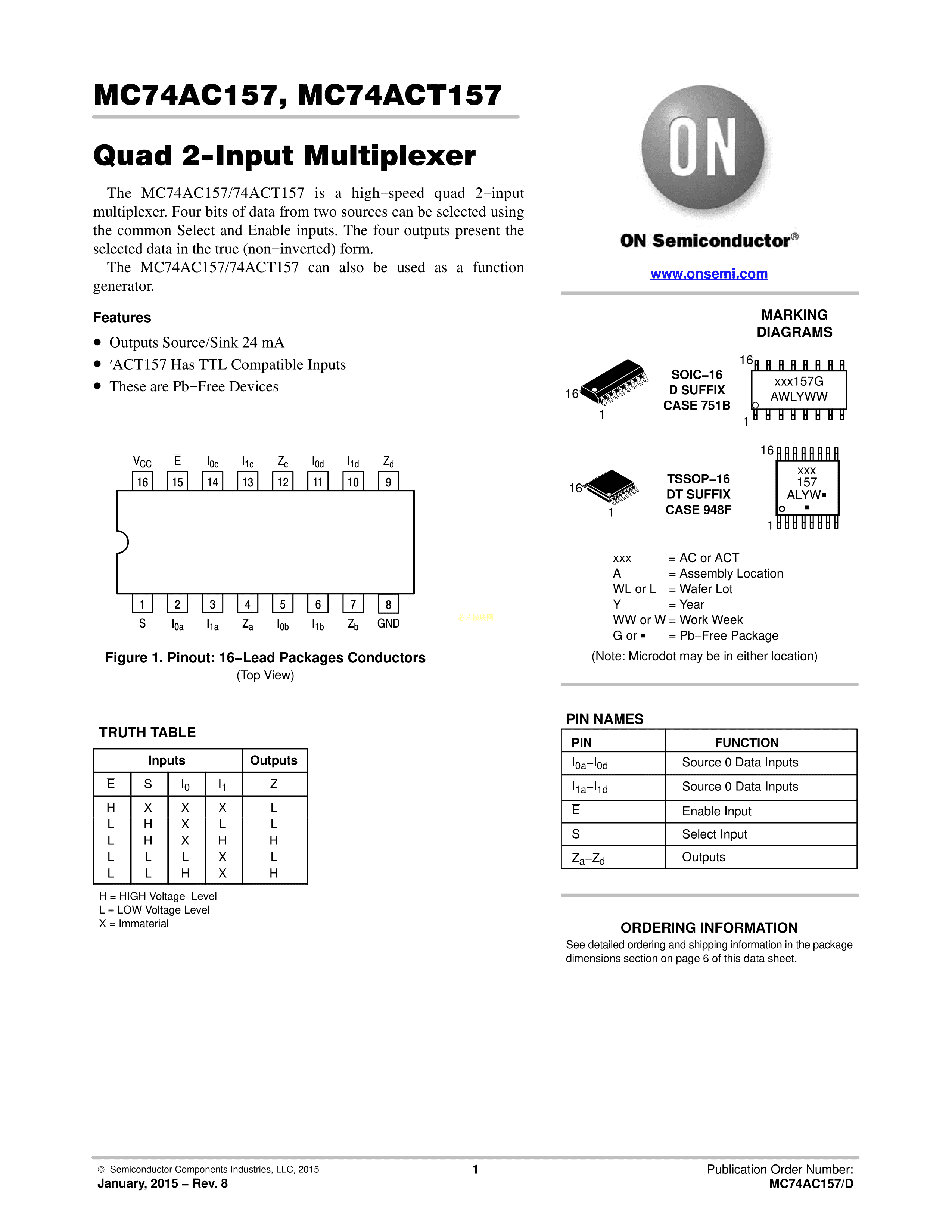 MC74ACT157DG数据手册SOIC-16封装onsemi(安森美)PDF规格书,中英文下载