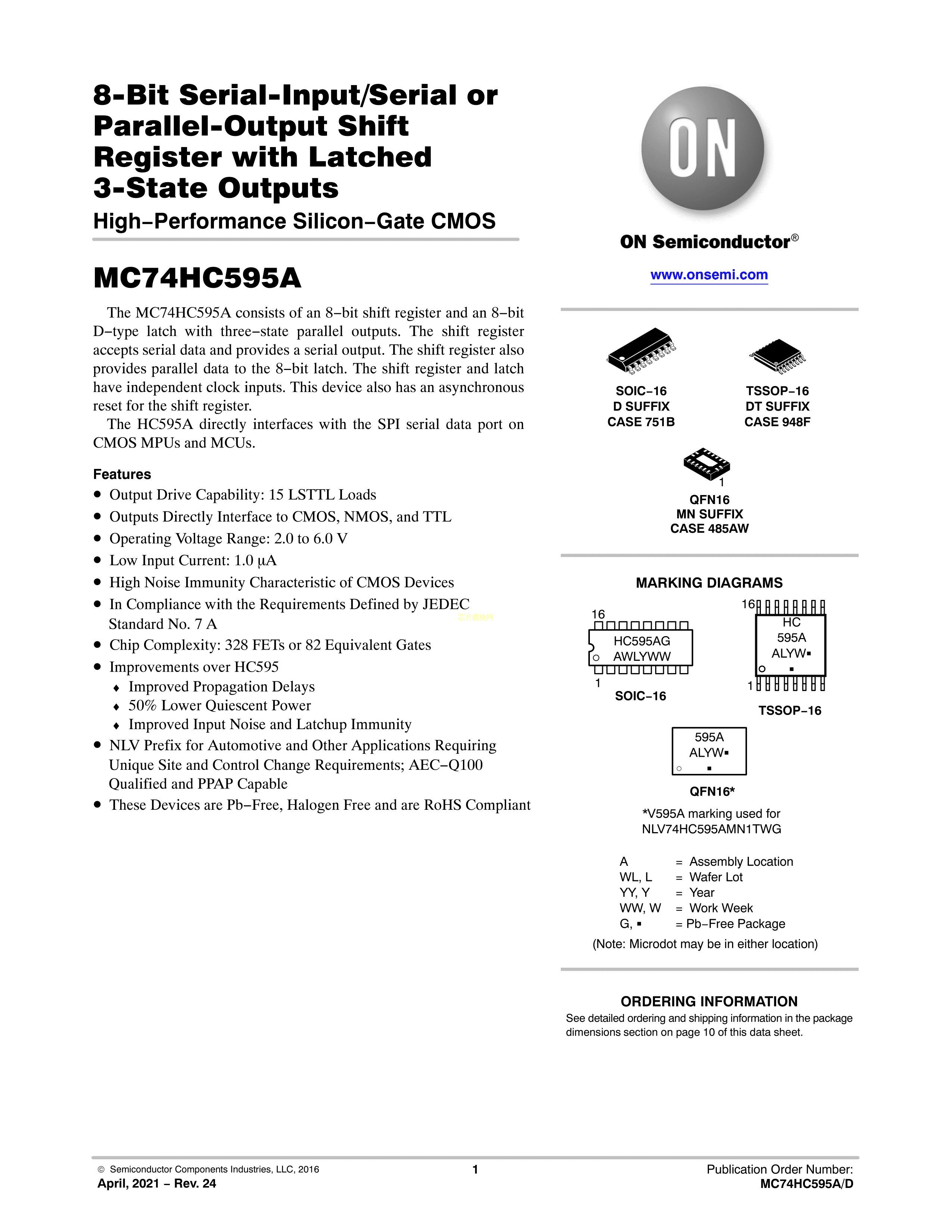 MC74HC595ADTG数据手册TSSOP-16封装onsemi(安森美)PDF规格书,中英文下载