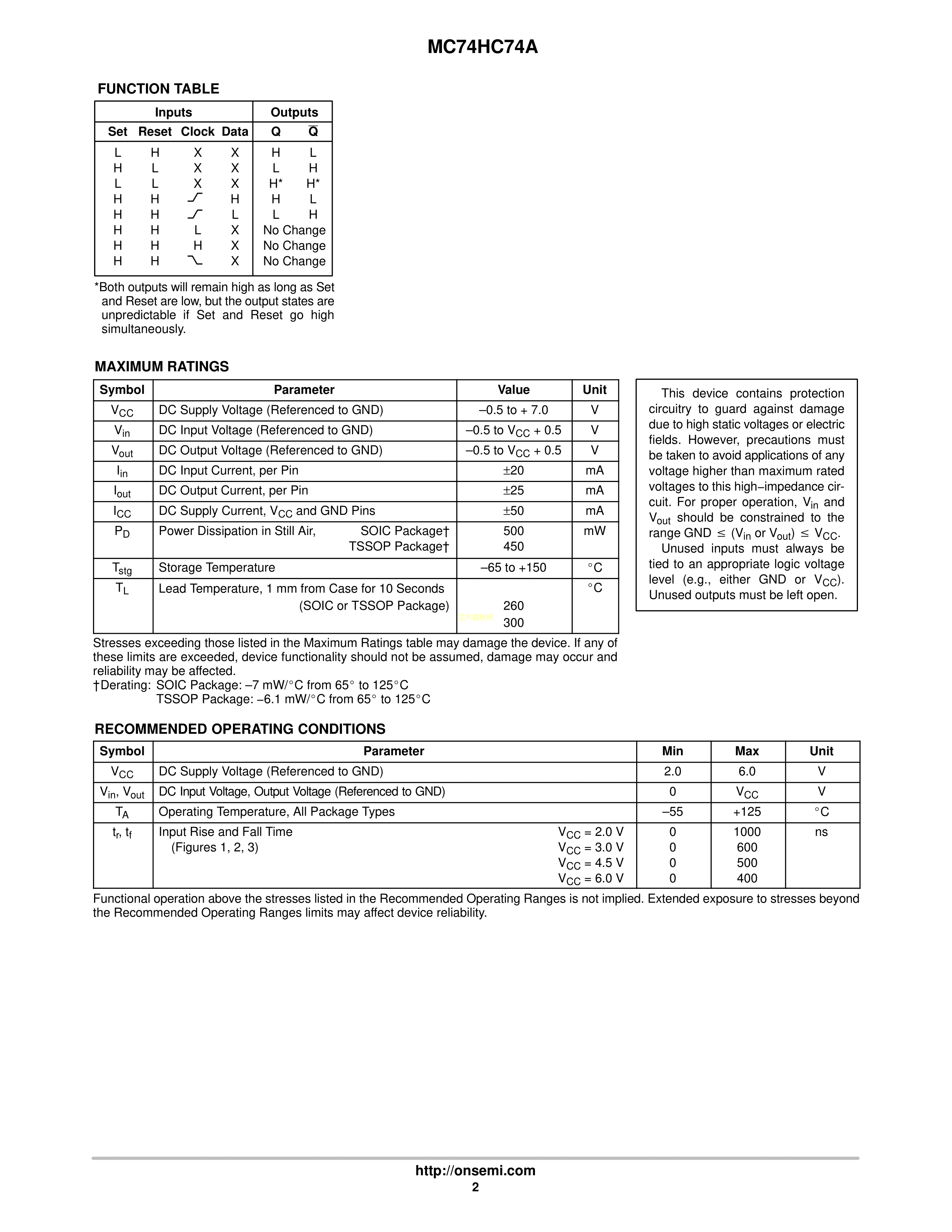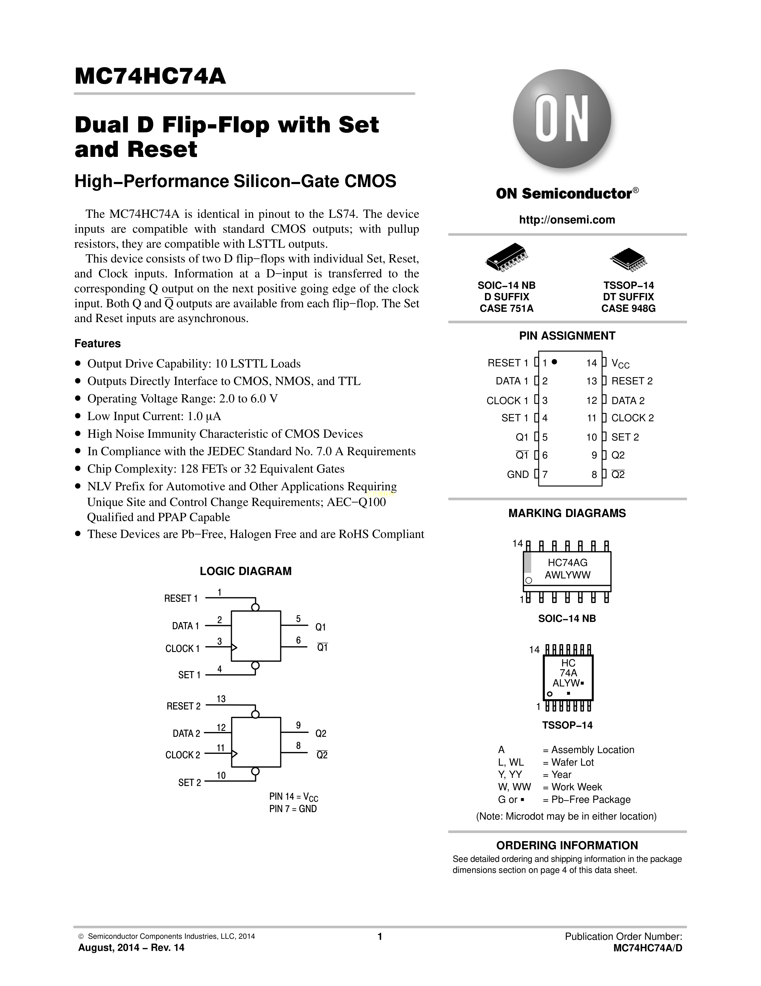 MC74HC74ADR2G数据手册SOIC-14_150mil封装onsemi(安森美)PDF规格书