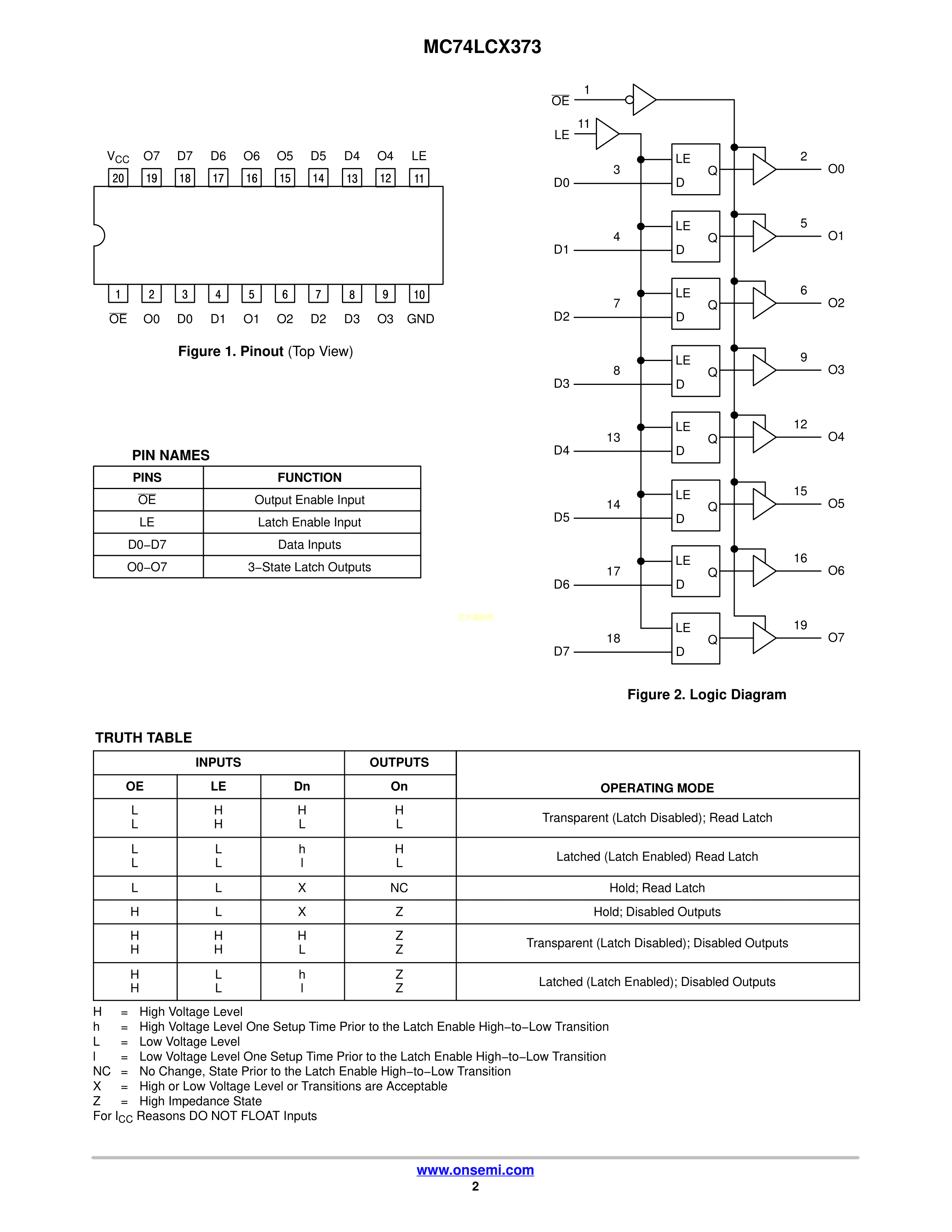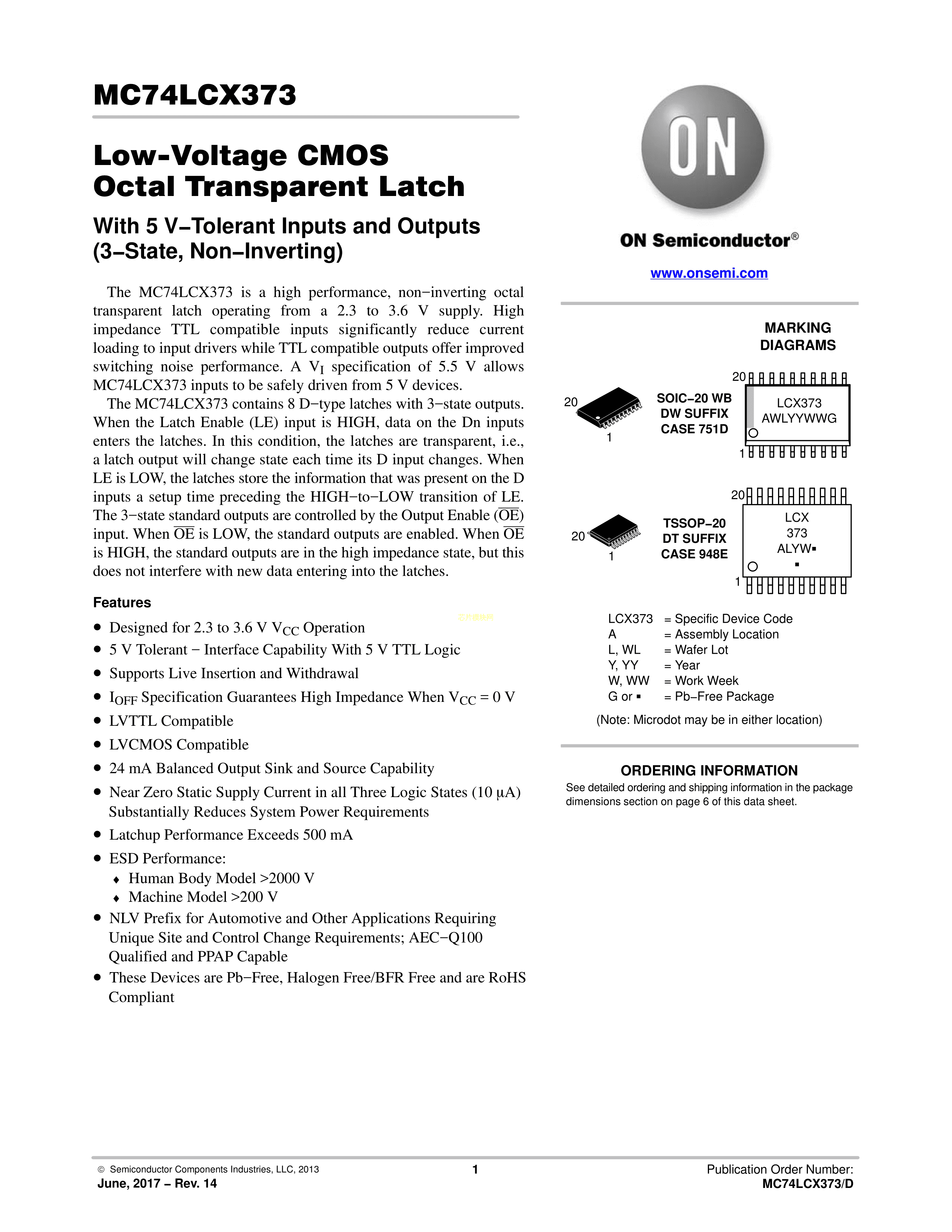 MC74LCX373DWR2G数据手册SOIC-20封装onsemi(安森美)PDF规格书,中英文下