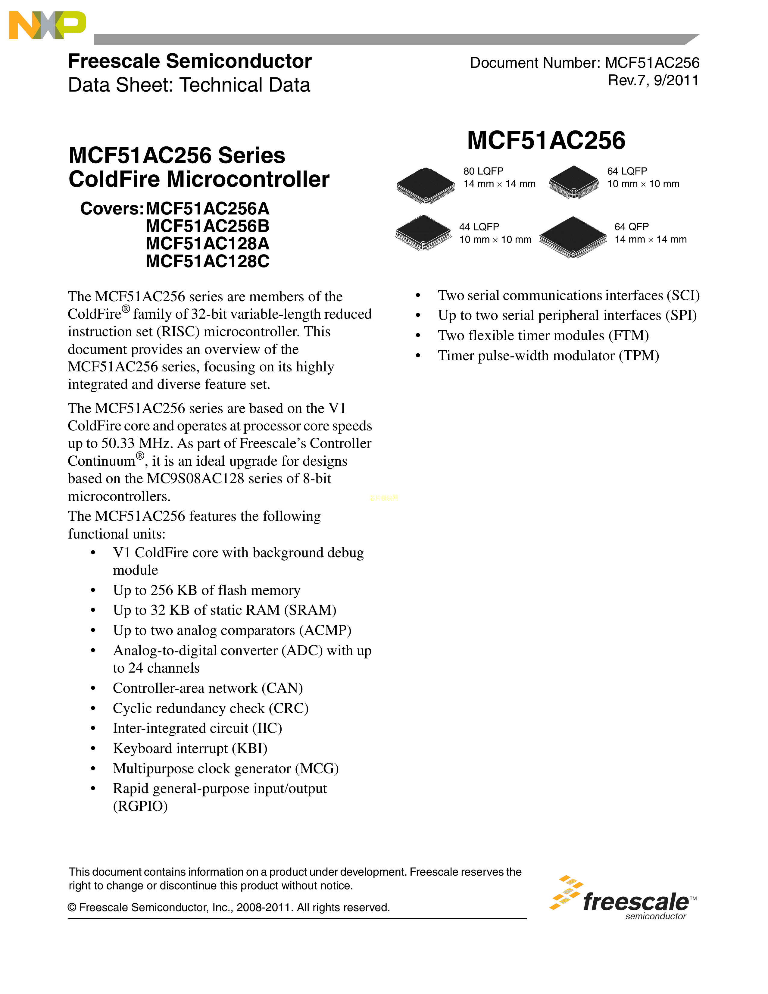 MCF51AC256BCFUE数据手册QFP-64(14x14)封装NXP(恩智浦)PDF规格书,中