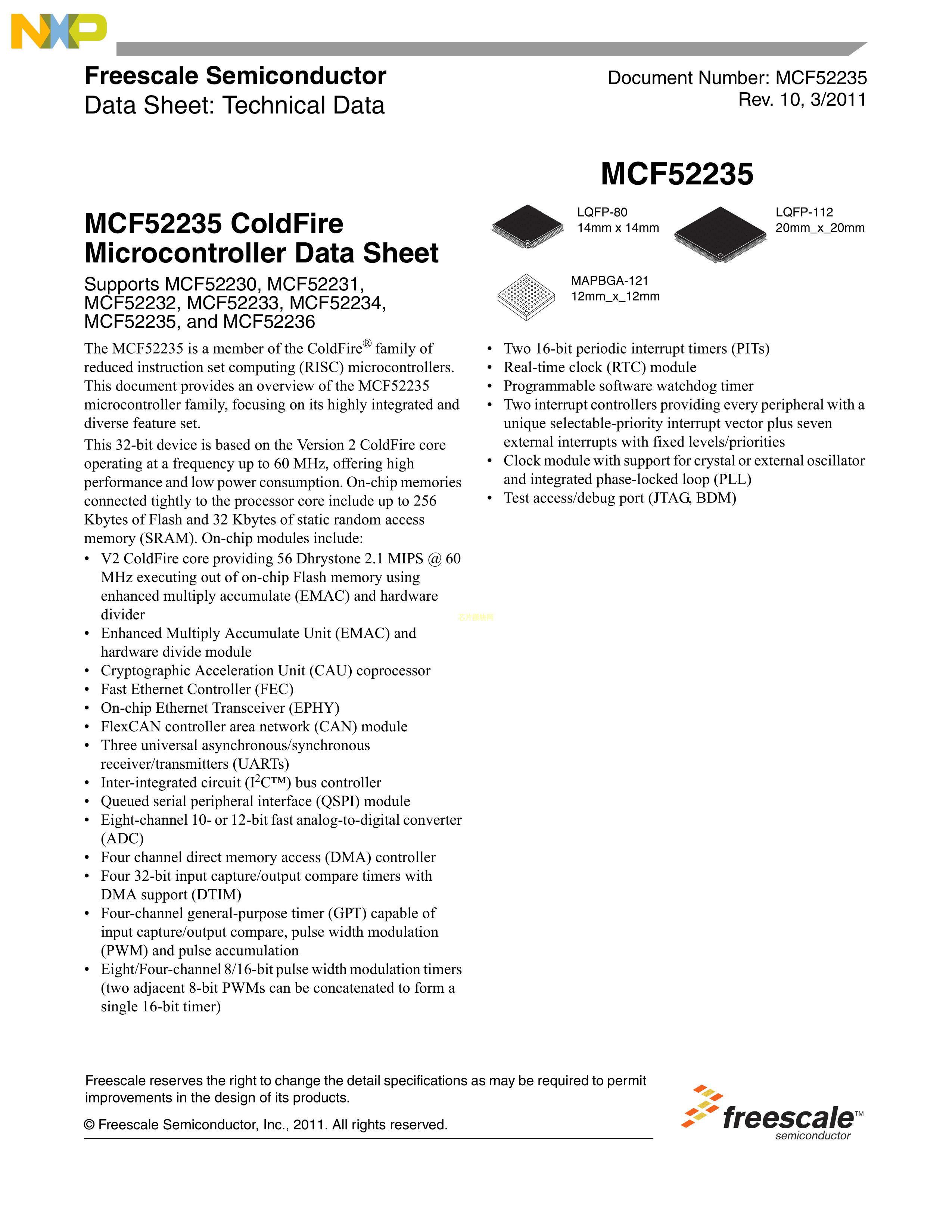 MCF52235CVM60数据手册MAPBGA-121(12x12)封装NXP(恩智浦)PDF规格书