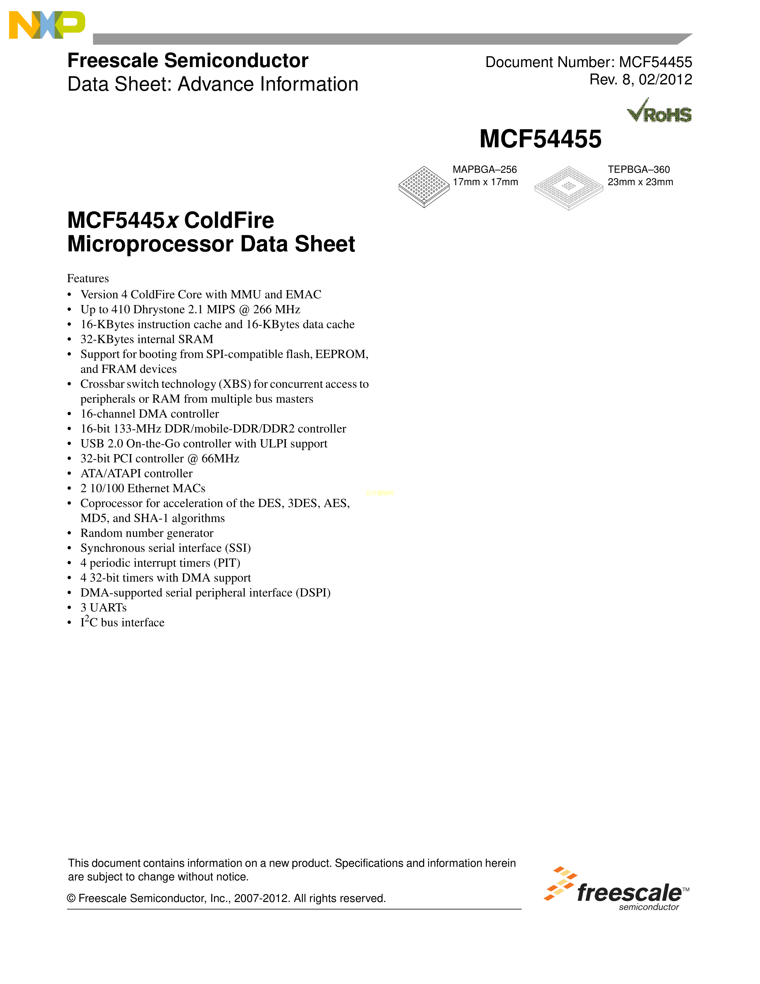 MCF54452VR266R数据手册TEPBGA-360(23x23)封装NXP(恩智浦)PDF规格