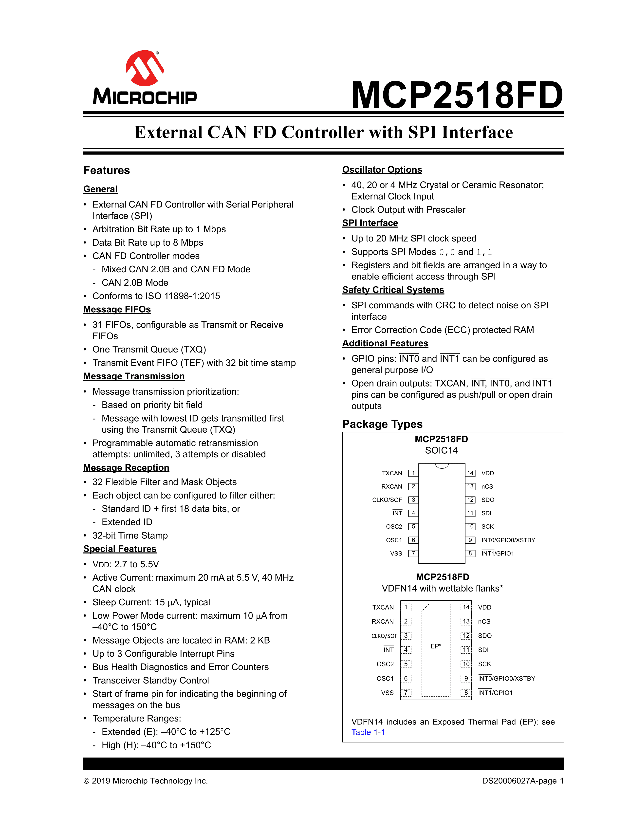 MCP2518FDT-H-SL数据手册SOIC-14封装MICROCHIP(美国微芯)PDF规格书,