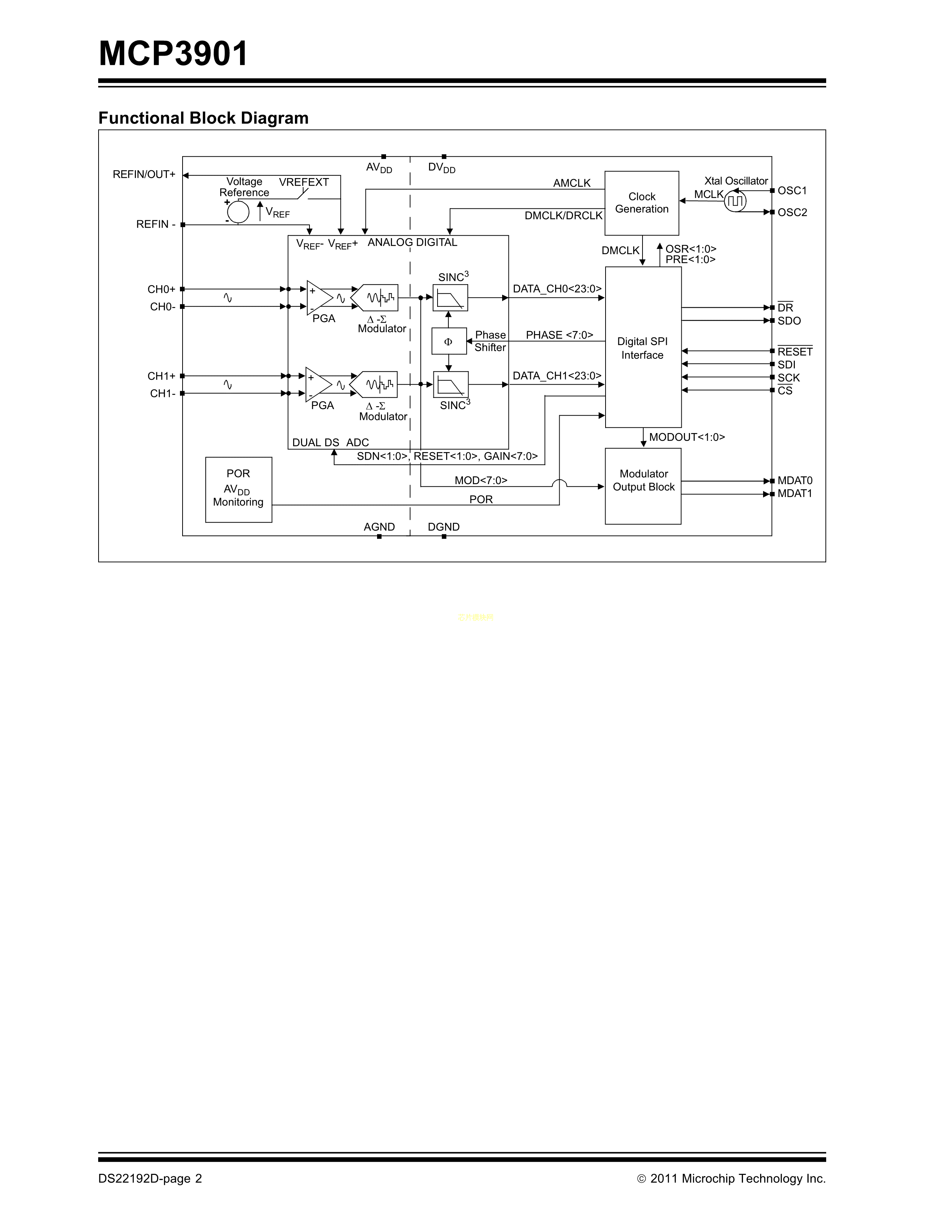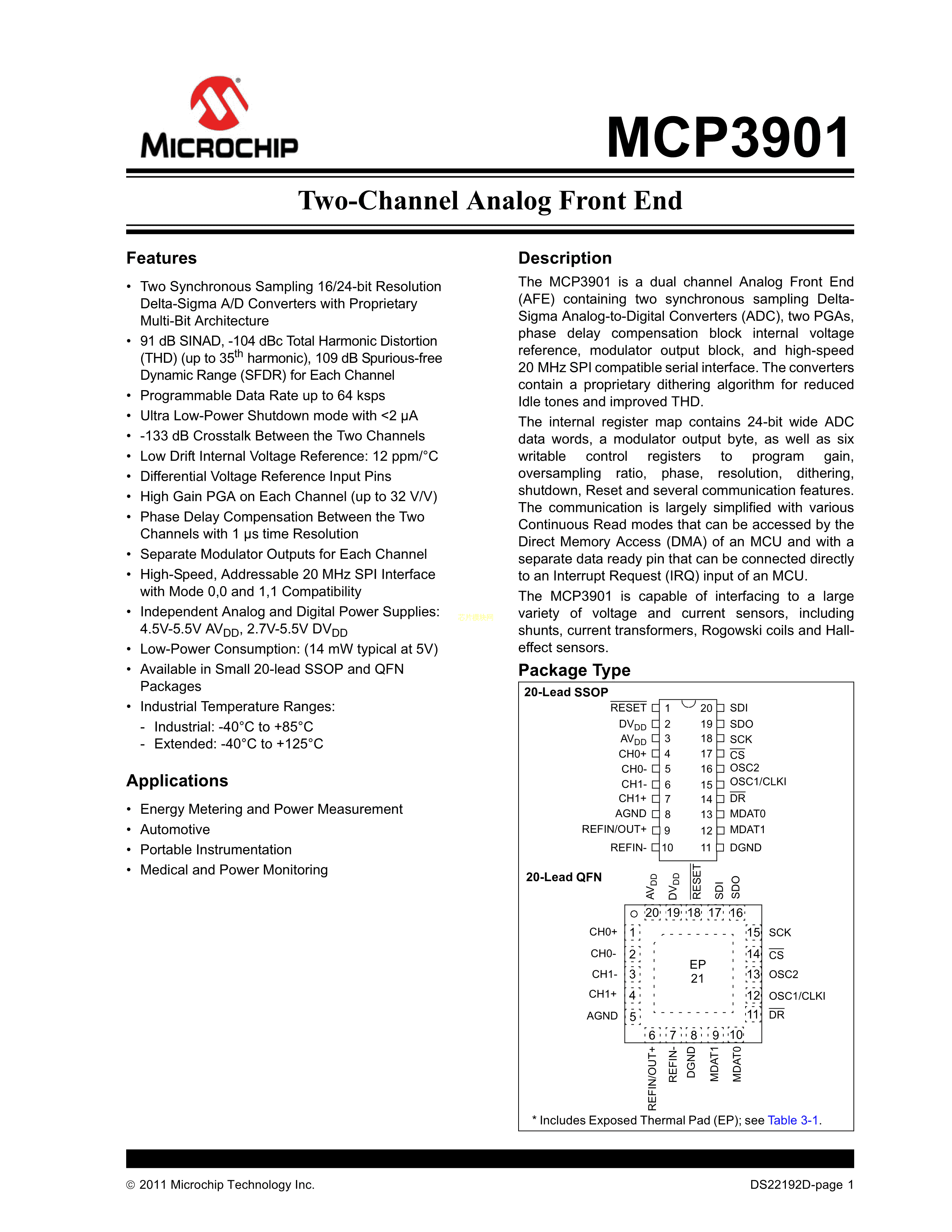 MCP3901A0T-I-SS数据手册SSOP-20封装MICROCHIP(美国微芯)PDF规格书,