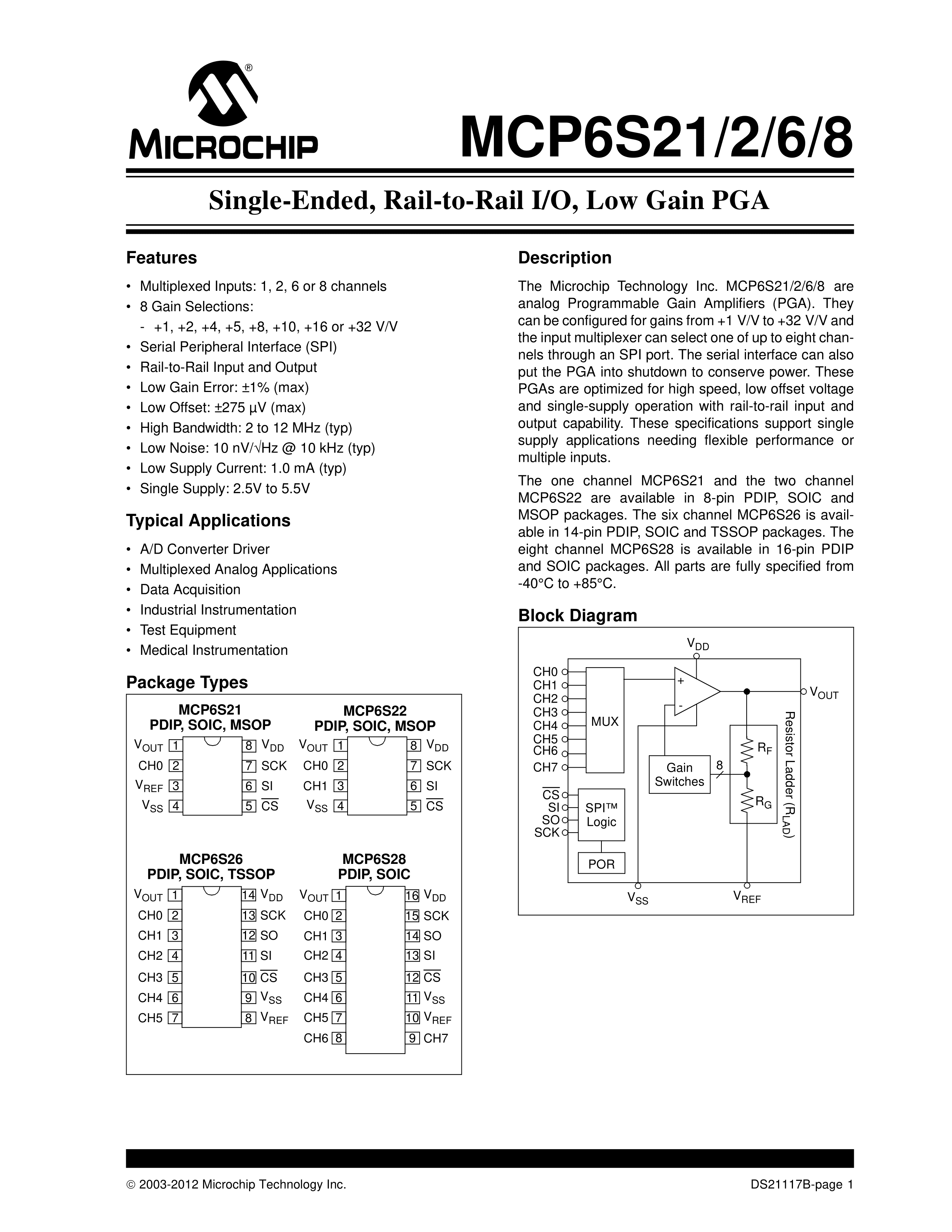 MCP6S21-I-MS数据手册MSOP-8封装MICROCHIP(美国微芯)PDF规格书,中英文下