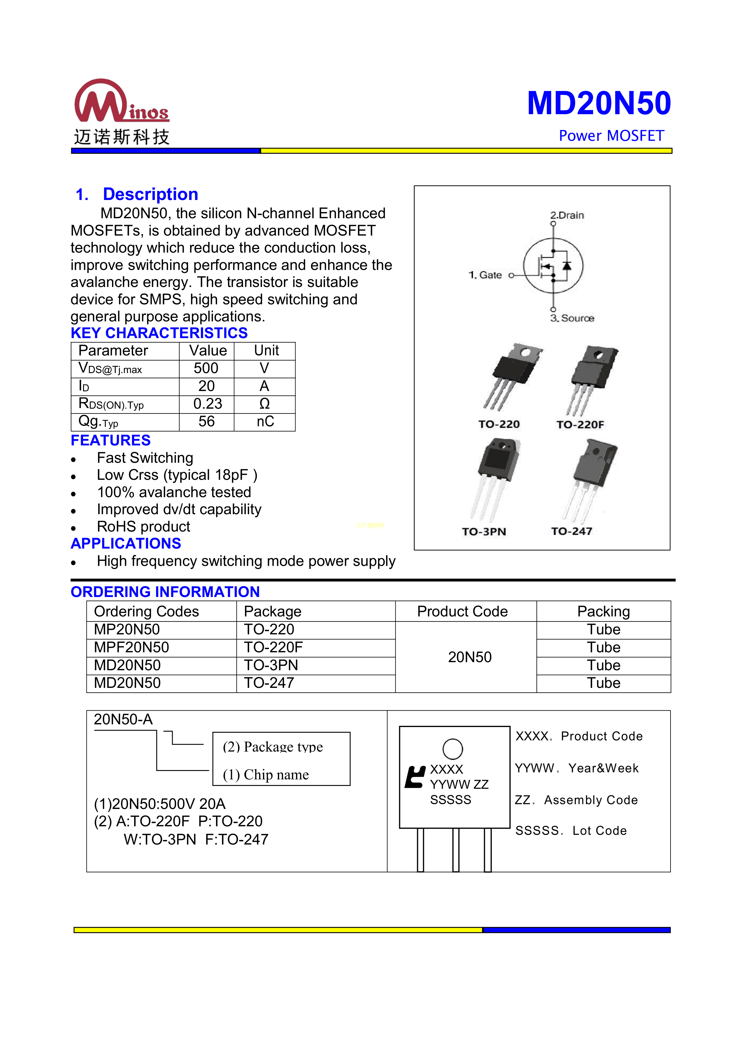 MD20N50数据手册TO-247封装minos(迈诺斯)PDF规格书,中英文下载