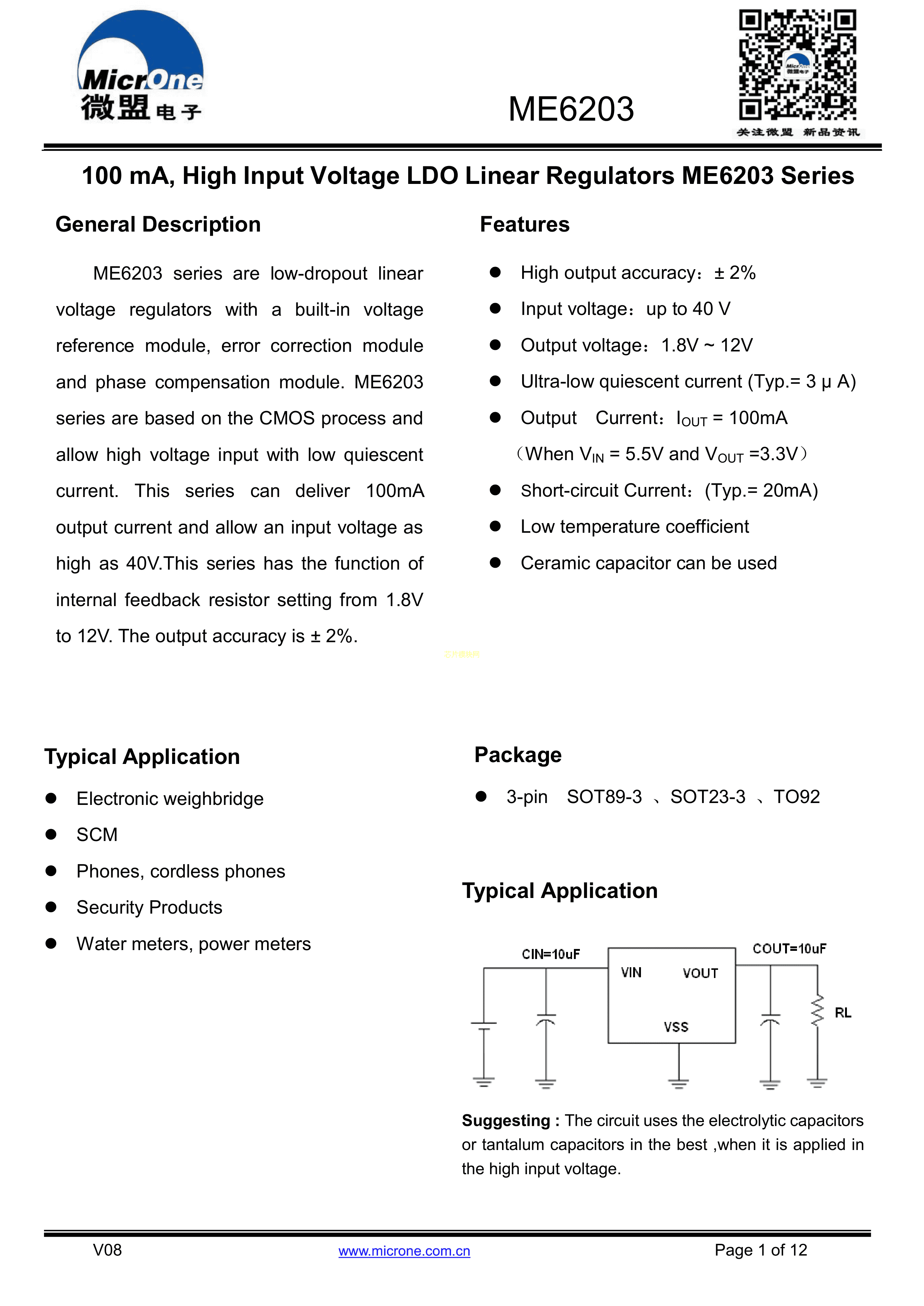 ME6203A30PG数据手册SOT-89(SOT-89-3)封装MICRONE(南京微盟)PDF规格书,中英文下载