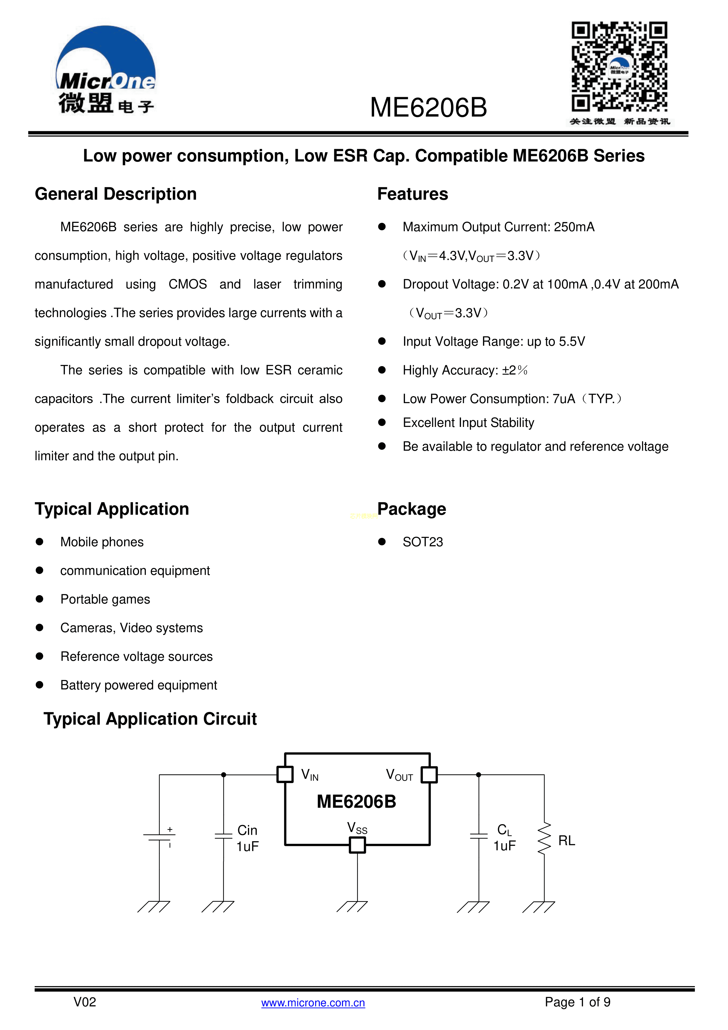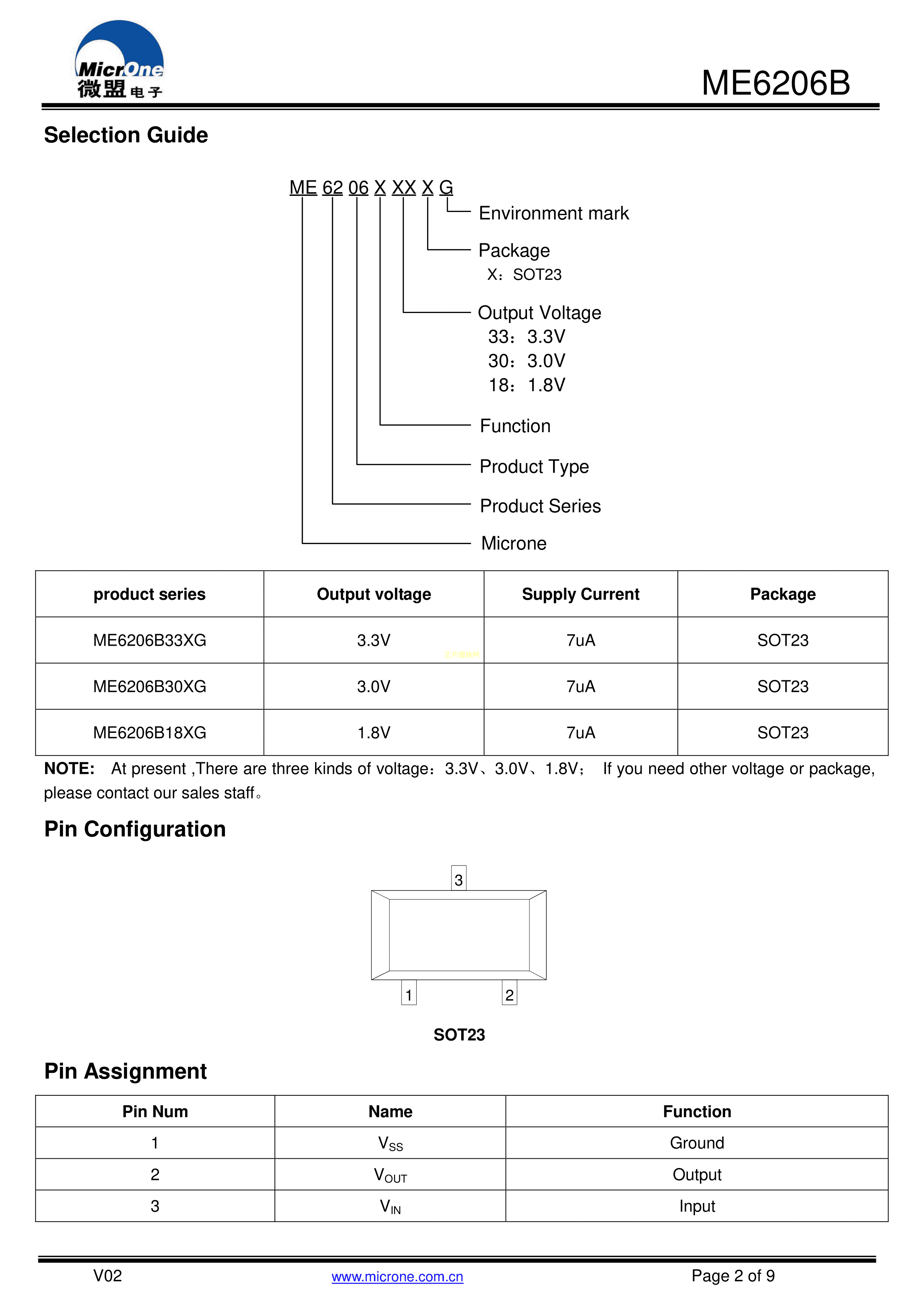 ME6206B18XG数据手册SOT-23封装MICRONE(南京微盟)PDF规格书,中英文下载