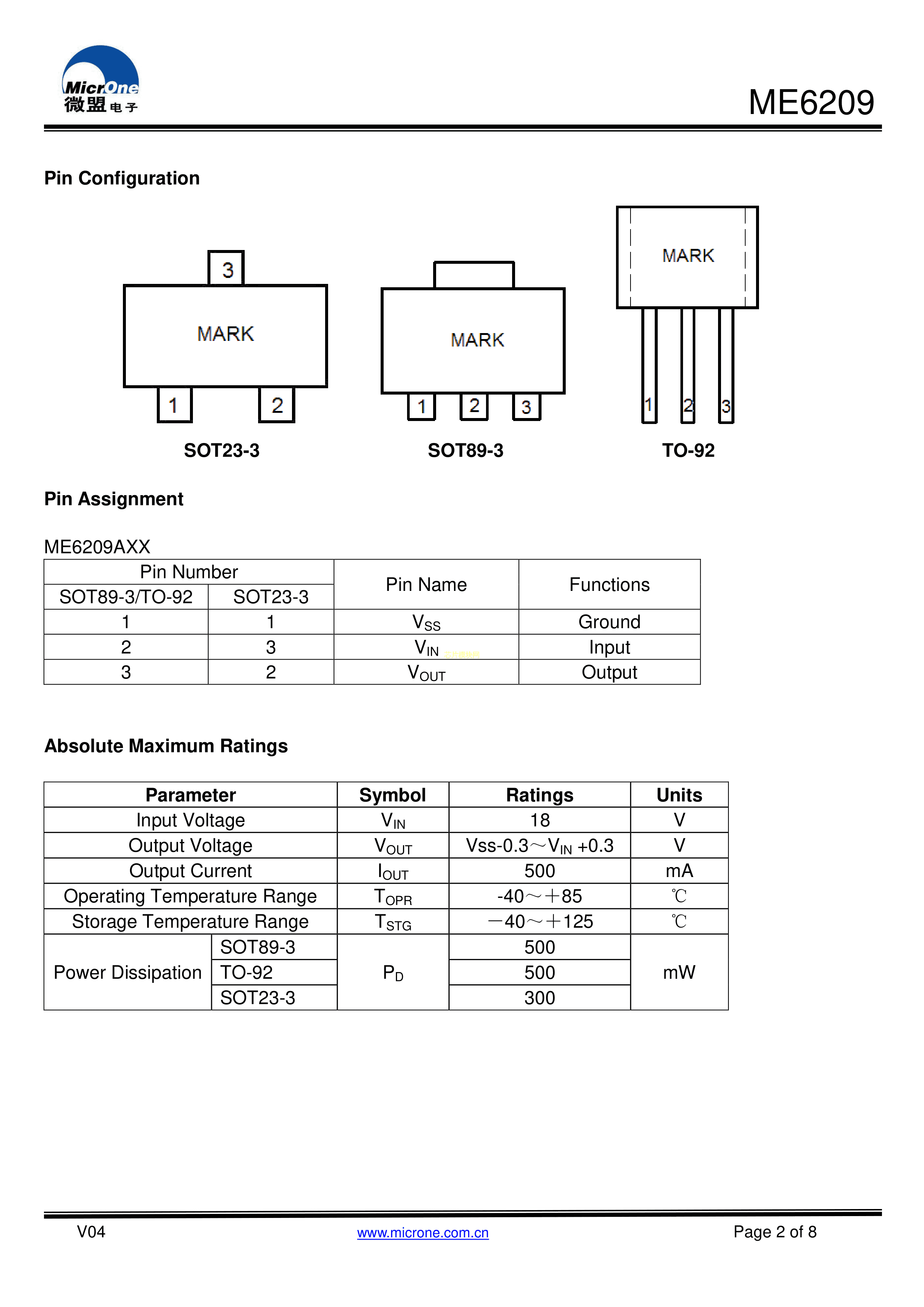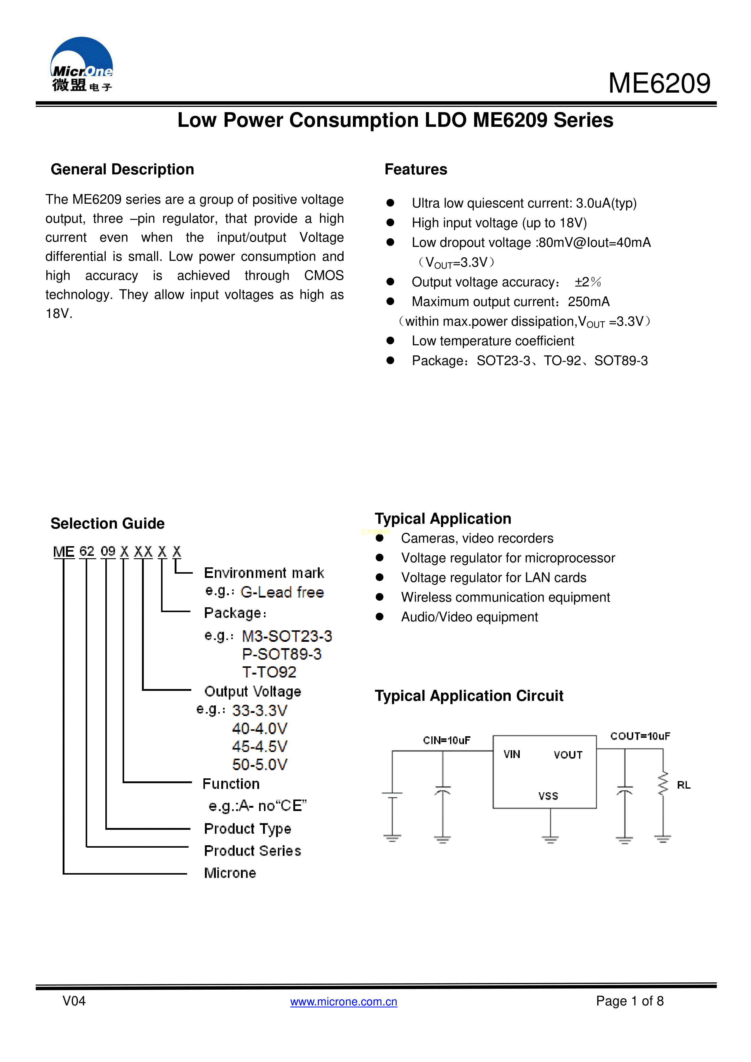 ME6209A33M3G数据手册SOT-23-3L封装MICRONE(南京微盟)PDF规格书,中英文下载