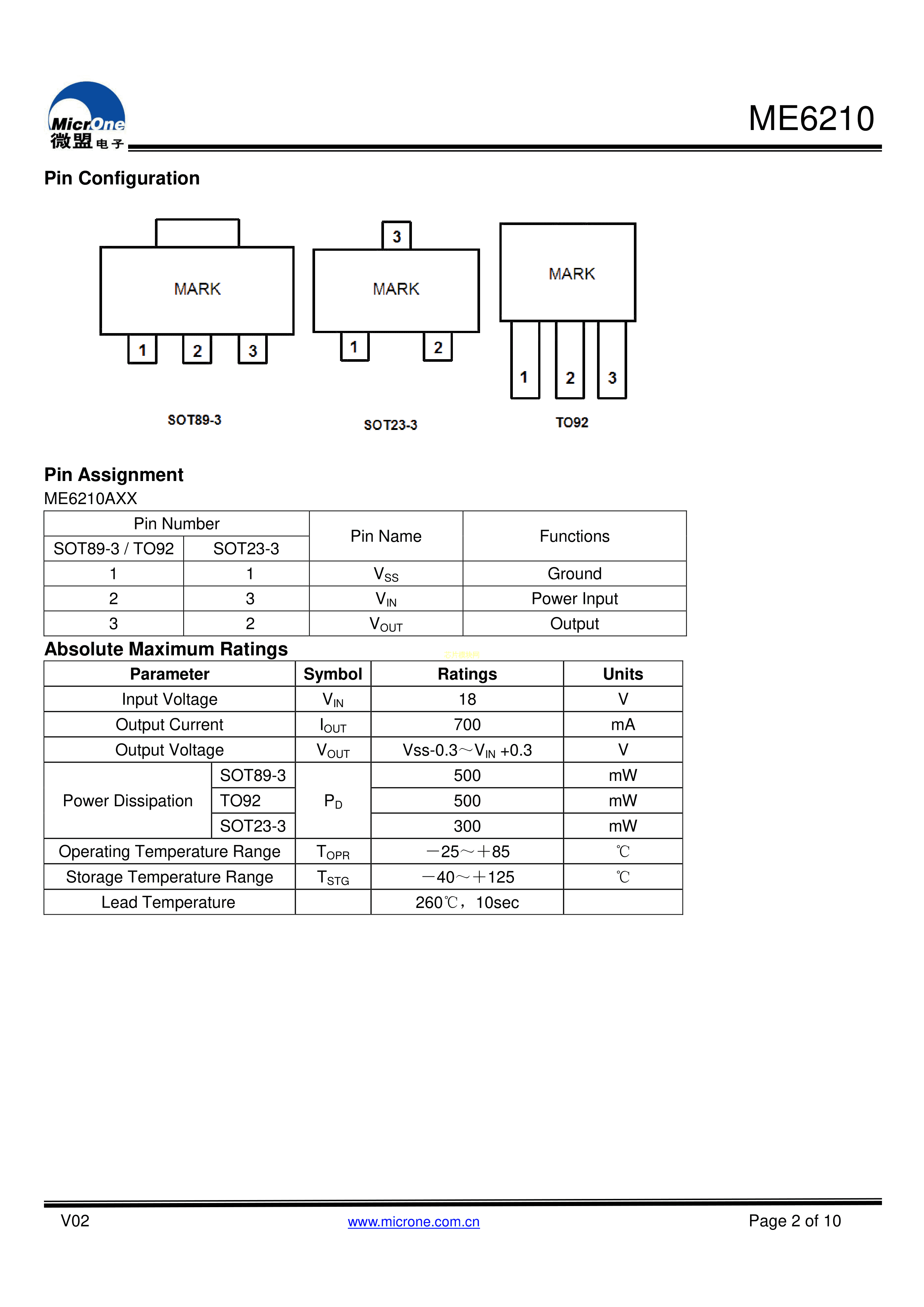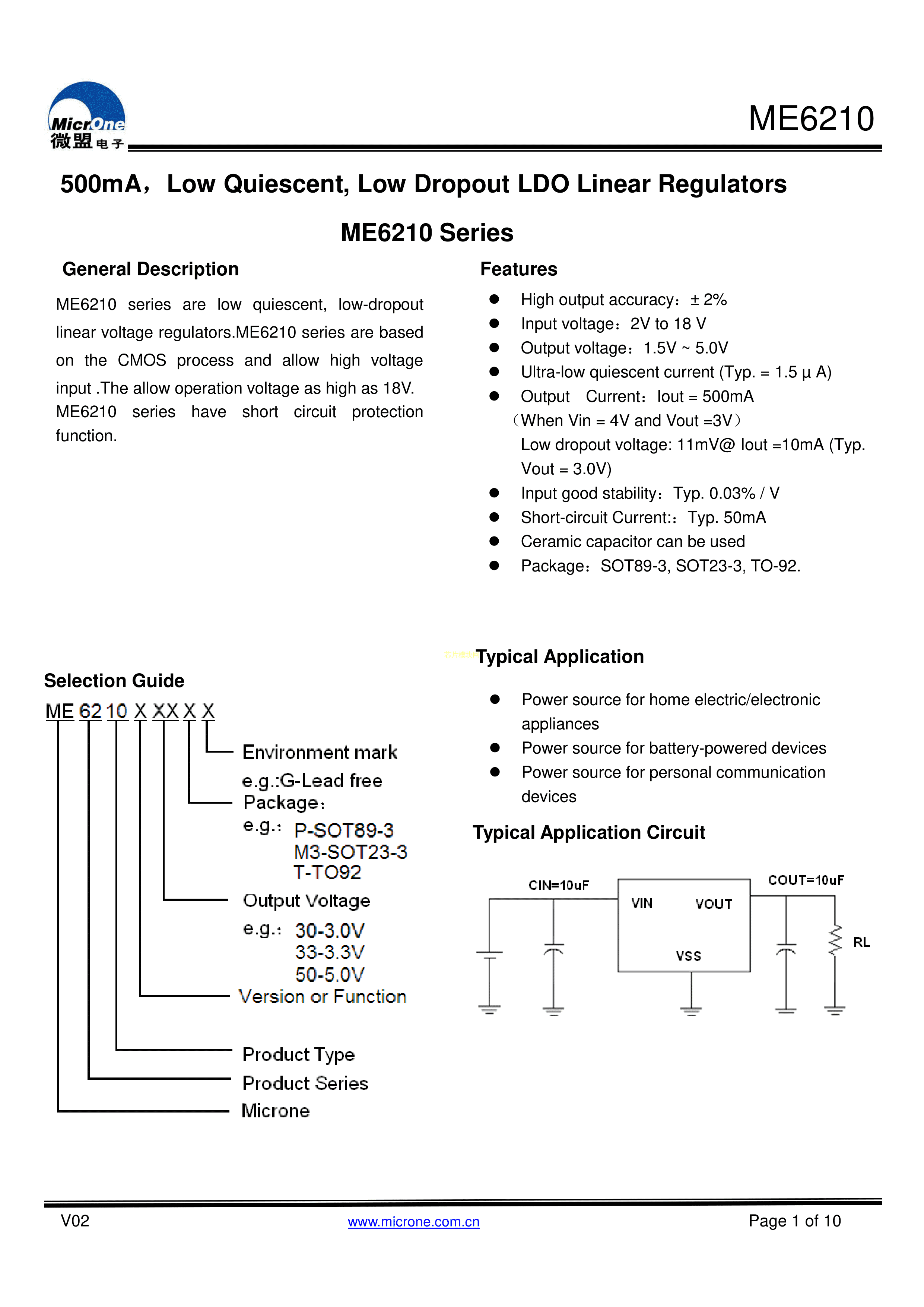 ME6210A50PG数据手册SOT-89(SOT-89-3)封装MICRONE(南京微盟)PDF规