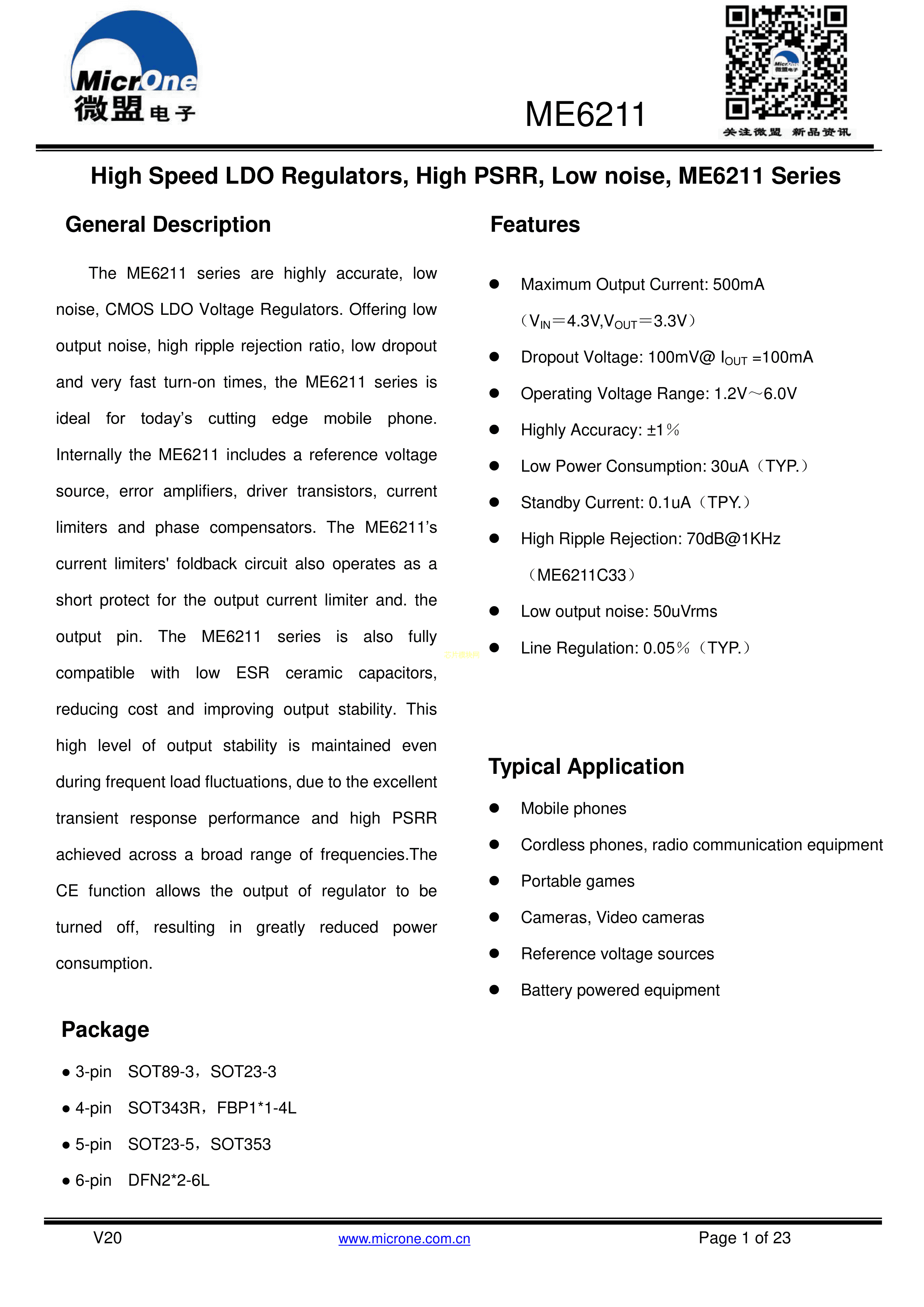 ME6211C25M5G-N数据手册SOT-23-5封装MICRONE(南京微盟)PDF规格书,中英