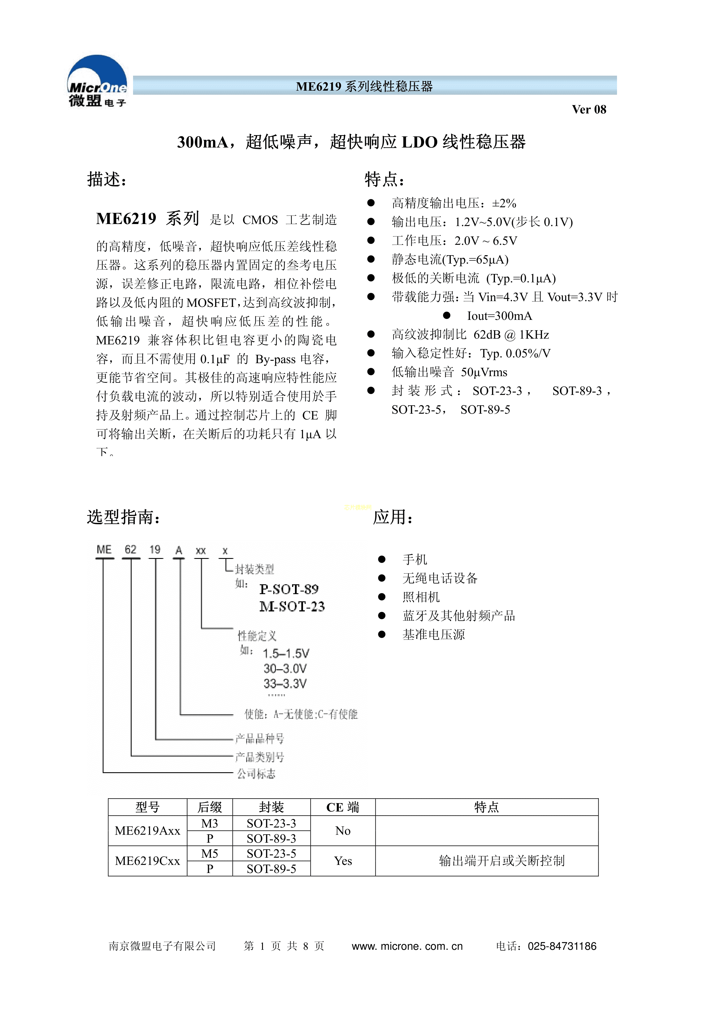 ME6219C13M5G数据手册SOT-23-5封装MICRONE(南京微盟)PDF规格书,中英文下