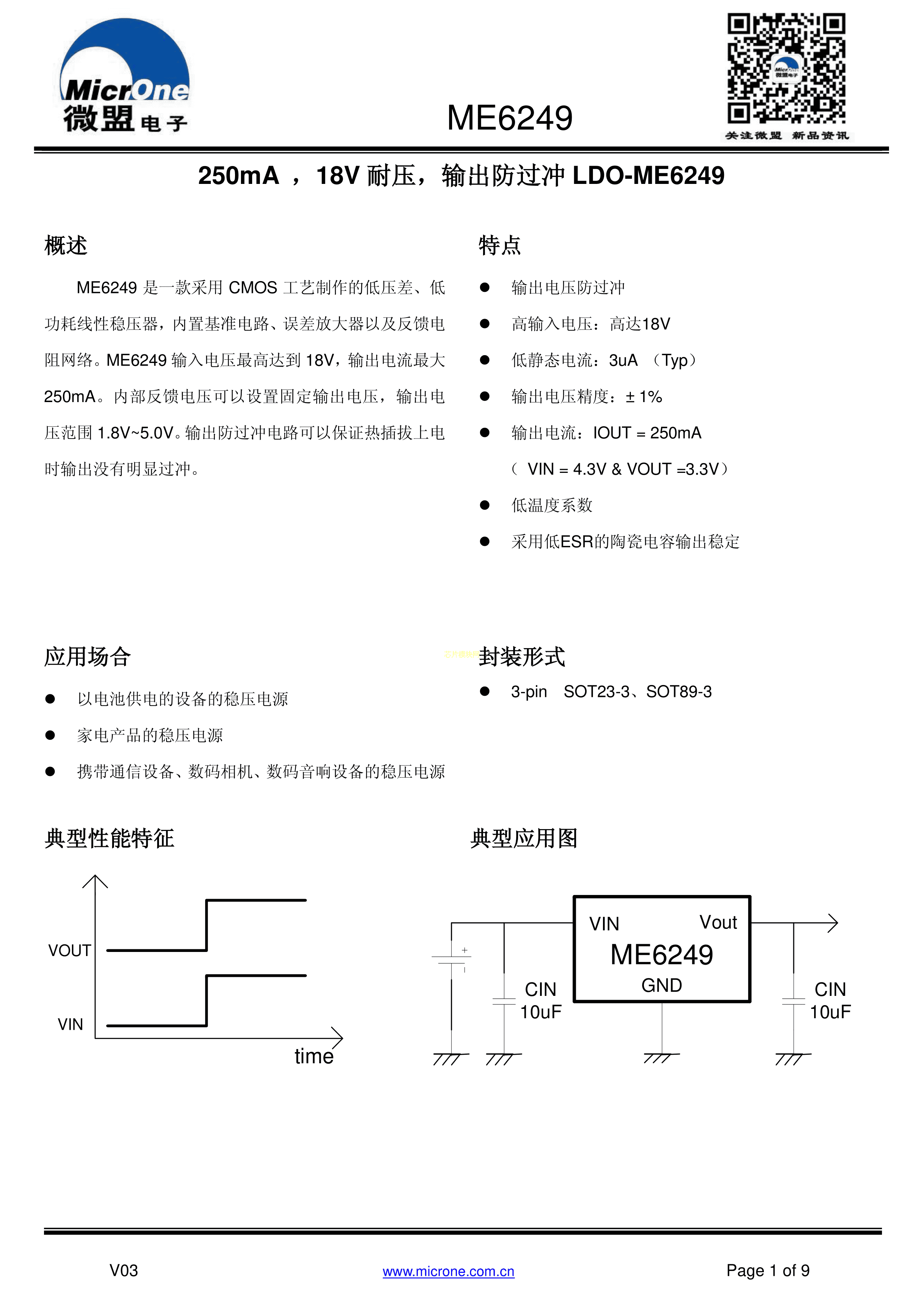 ME6249A33PG数据手册SOT-89-3封装MICRONE(南京微盟)PDF规格书,中英文下载