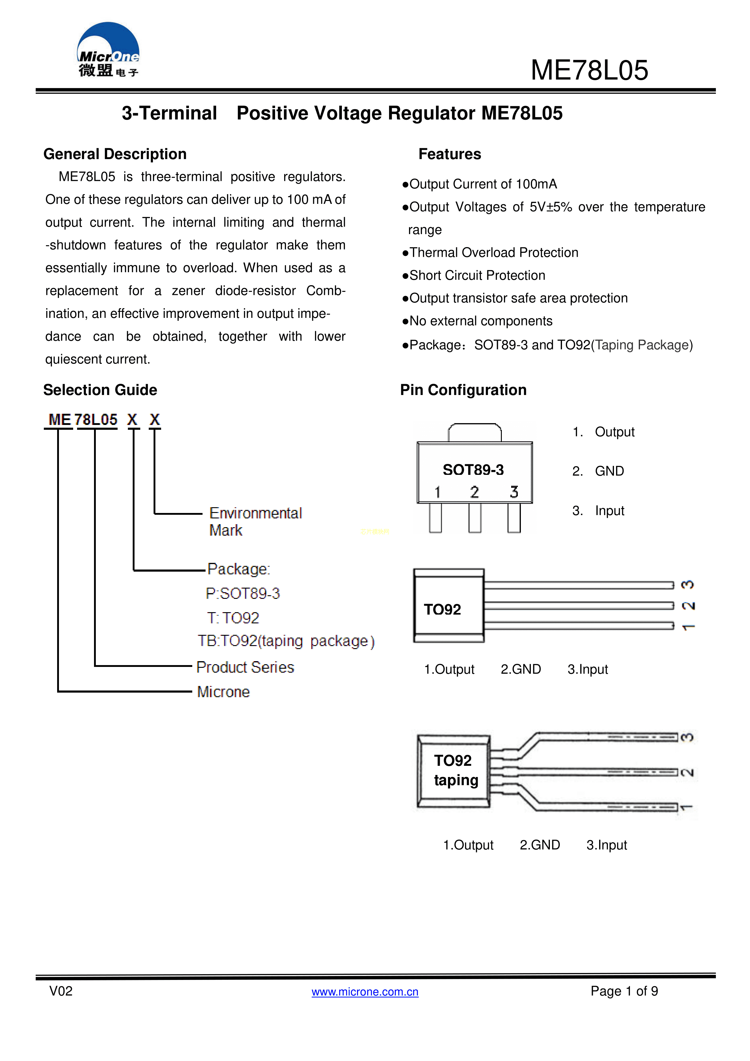 ME78L05PG数据手册SOT-89(SOT-89-3)封装MICRONE(南京微盟)PDF规格书