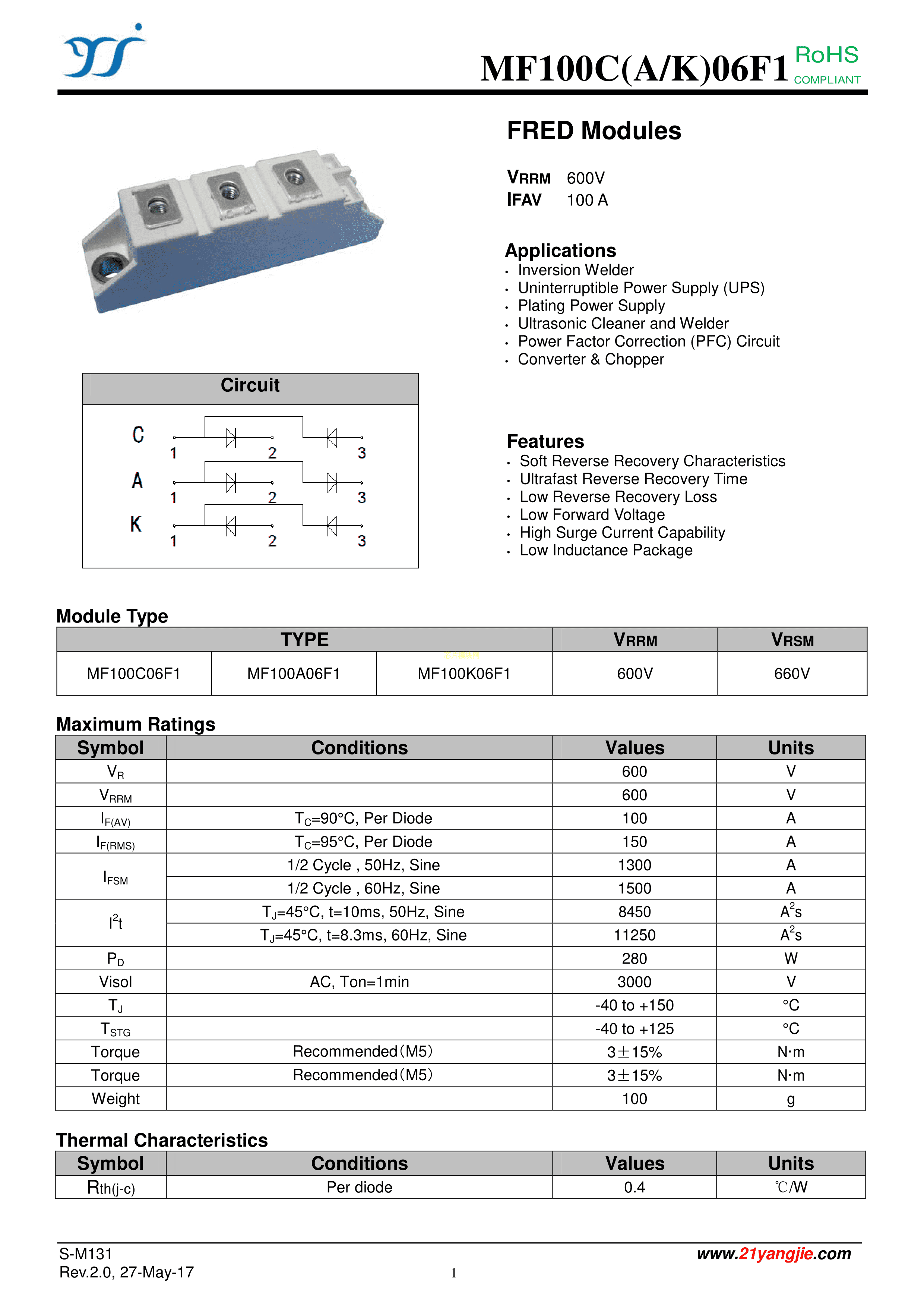MF100A06F1数据手册F1封装YANGJIE(扬杰)PDF规格书,中英文下载