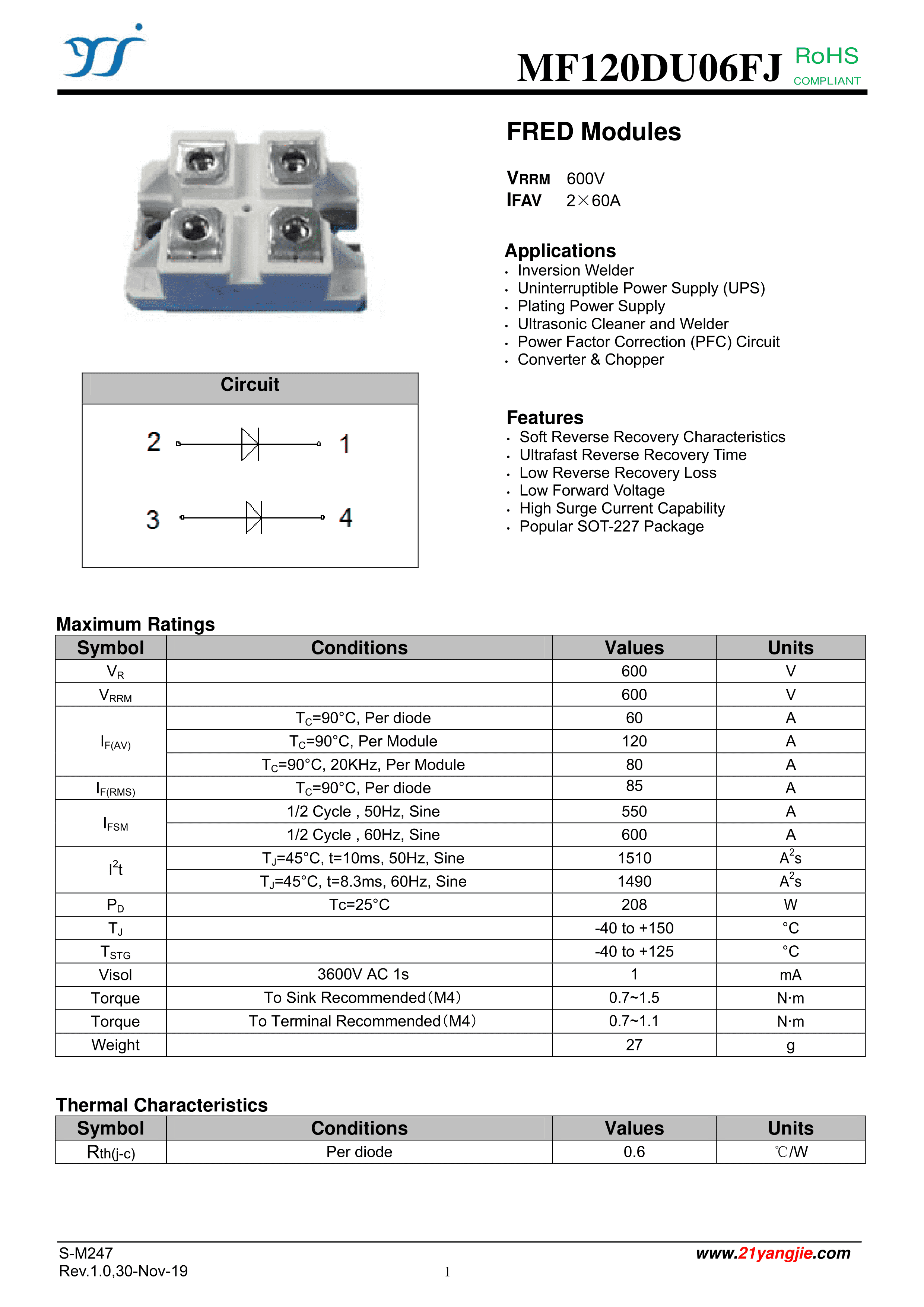 MF120DU06FJ数据手册FJ封装YANGJIE(扬杰)PDF规格书,中英文下载