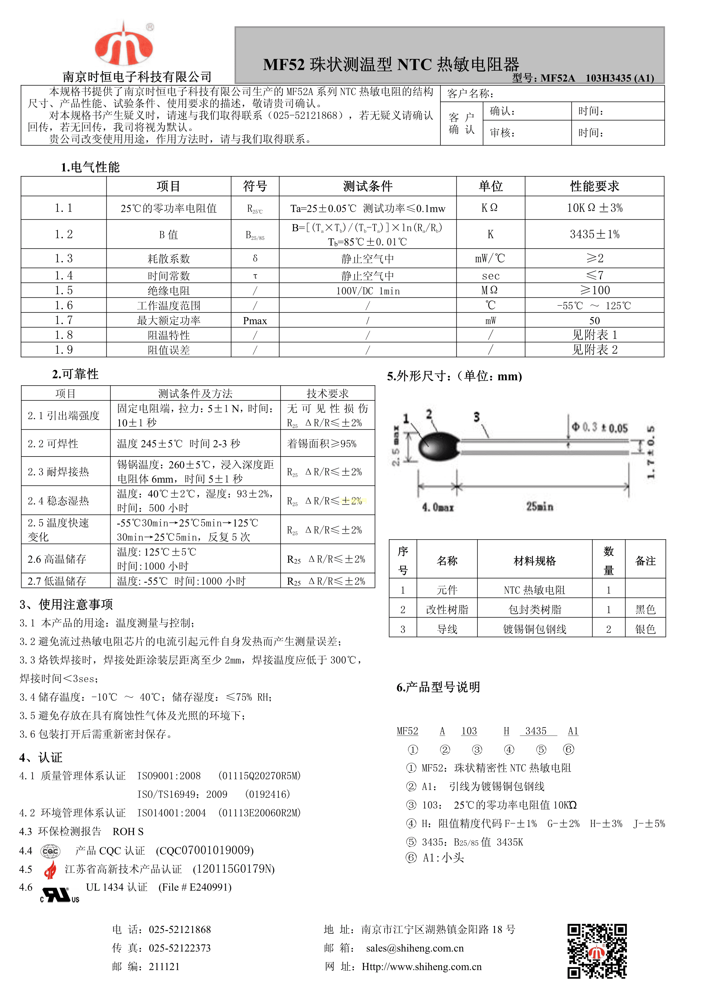 MF52A103H3435(A1)数据手册径向引线P1.7mm封装时恒PDF规格书,中英文下载