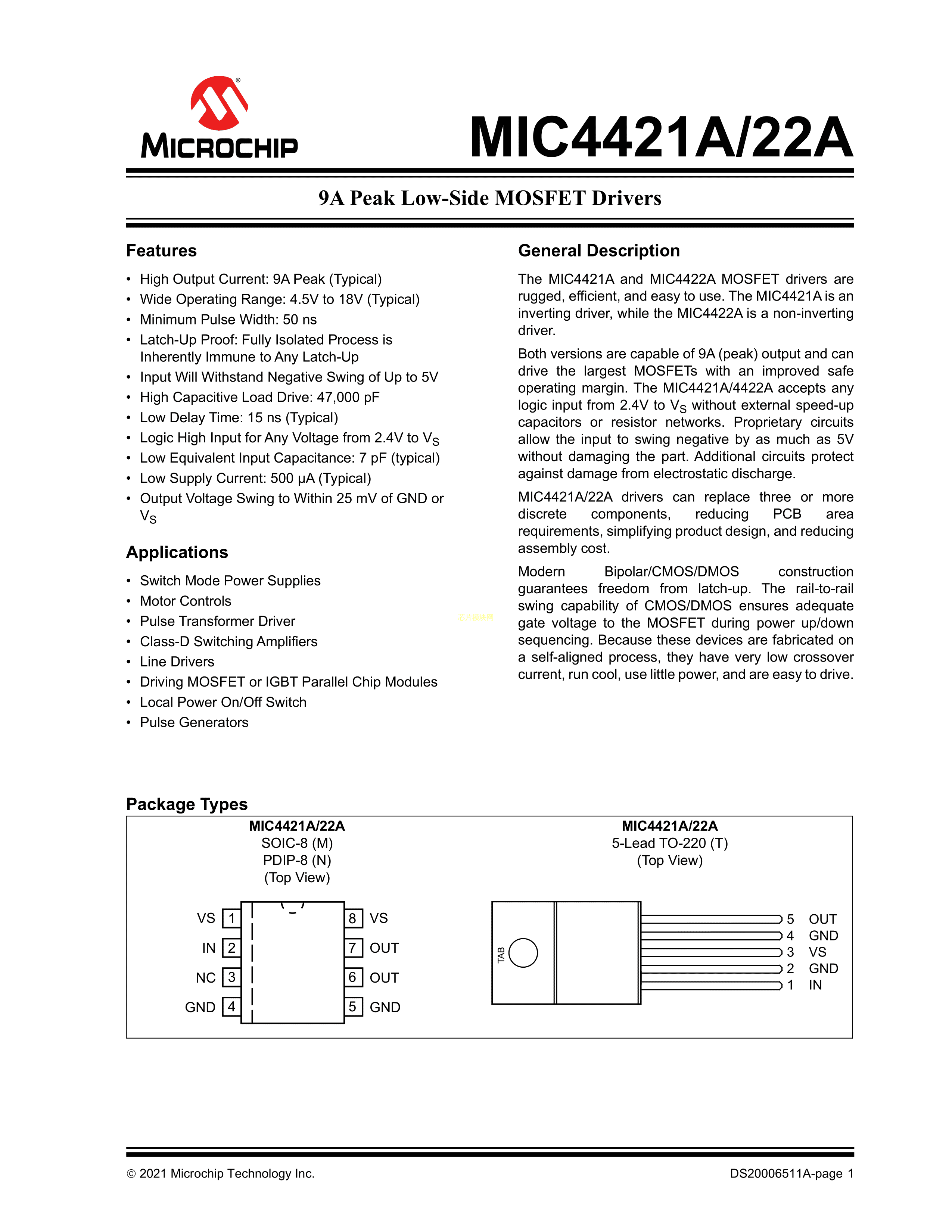 MIC4421AYM数据手册SOIC-8封装MICROCHIP(美国微芯)PDF规格书,中英文下载