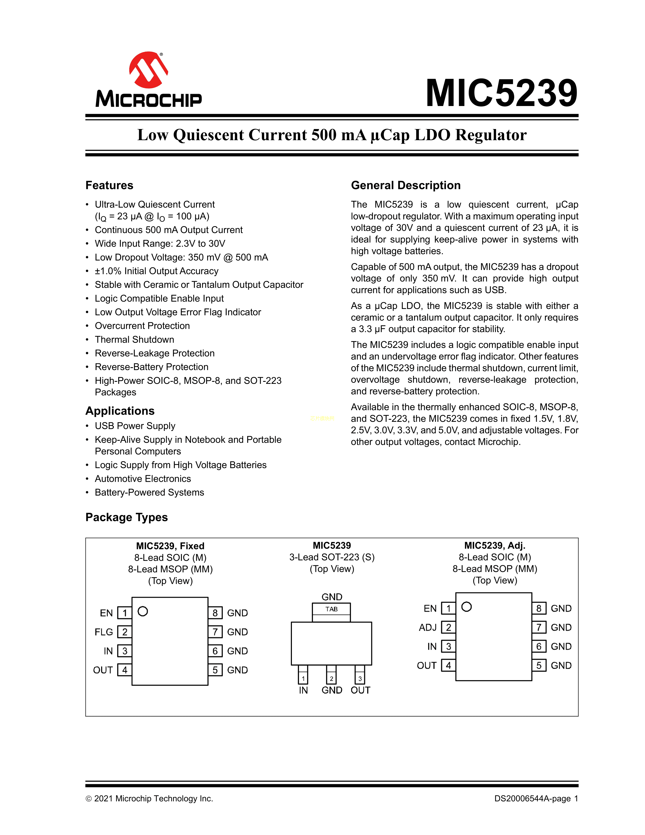 MIC5239-5.0YS数据手册SOT-223-3封装MICROCHIP(美国微芯)PDF规格书,