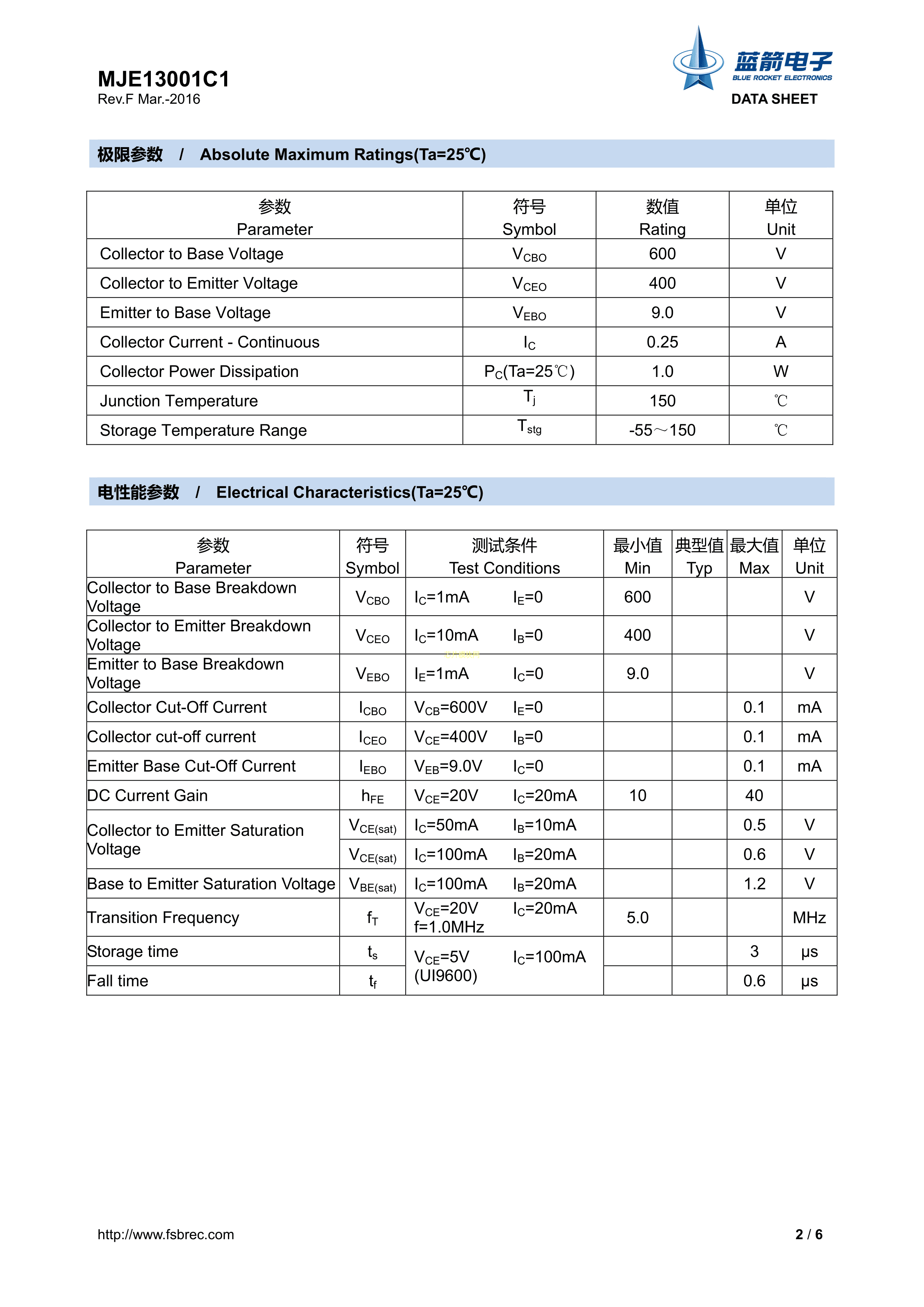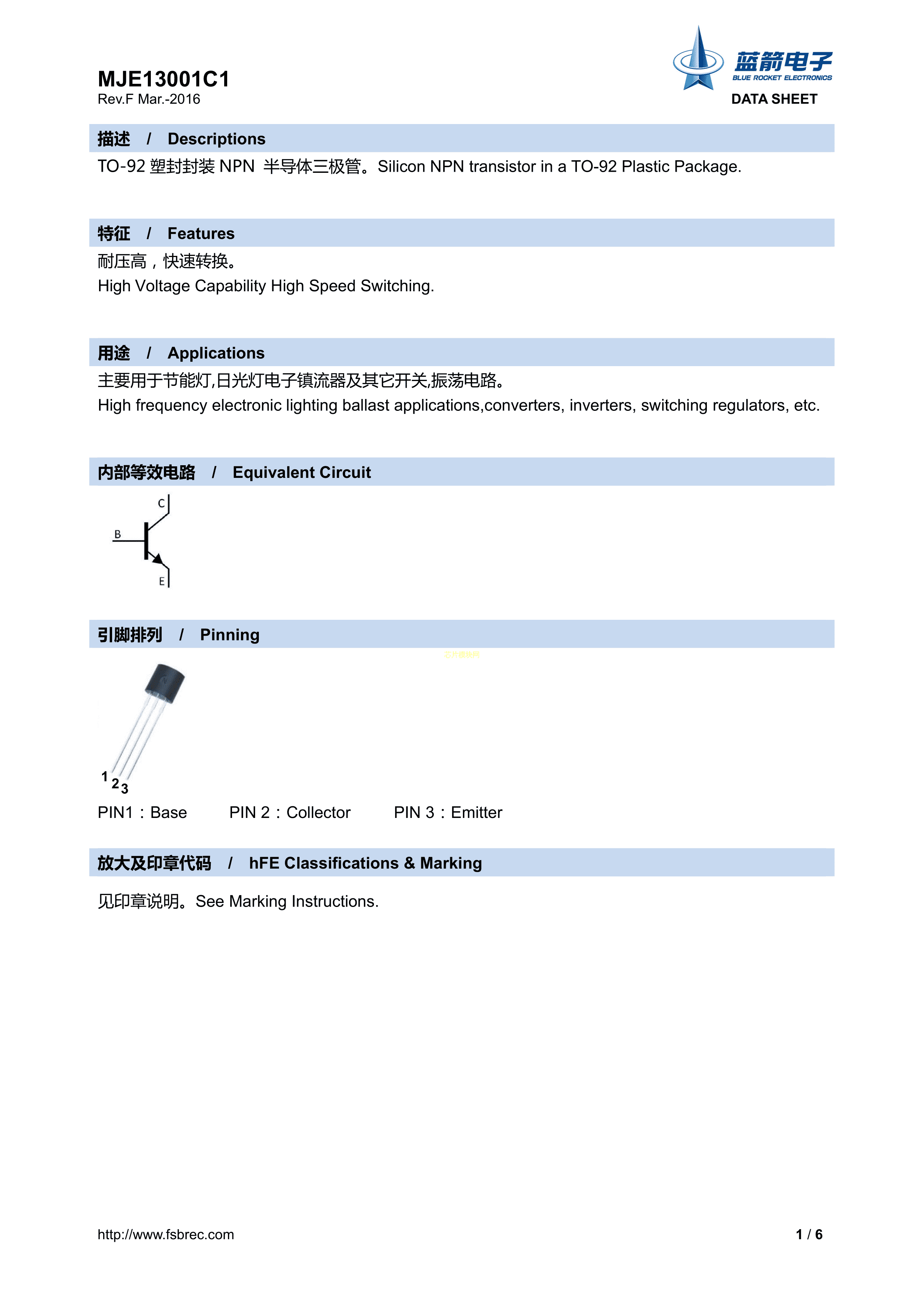 MJE13001C1数据手册TO-92封装BLUE ROCKET(蓝箭)PDF规格书,中英文下载