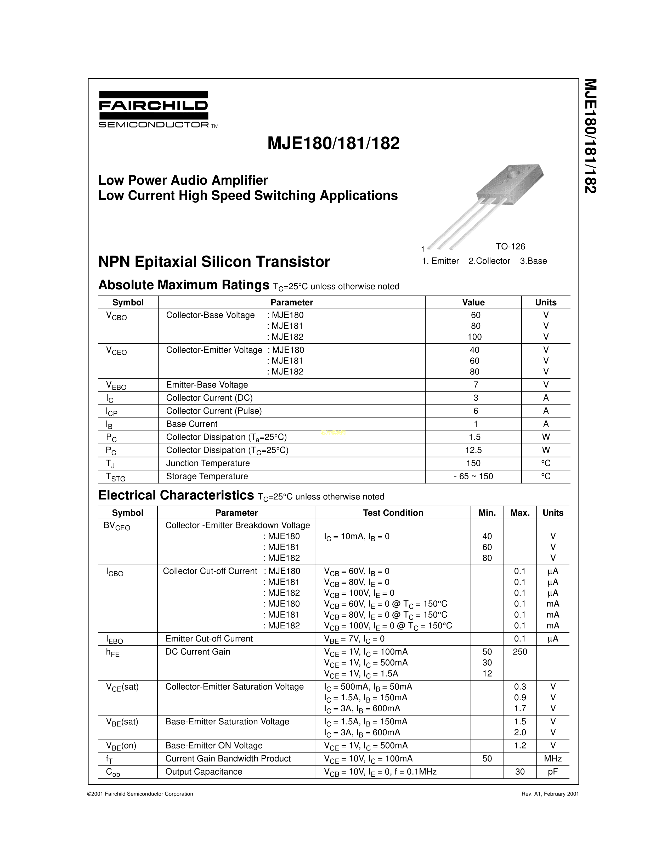 MJE180STU数据手册TO-126封装onsemi(安森美)PDF规格书,中英文下载