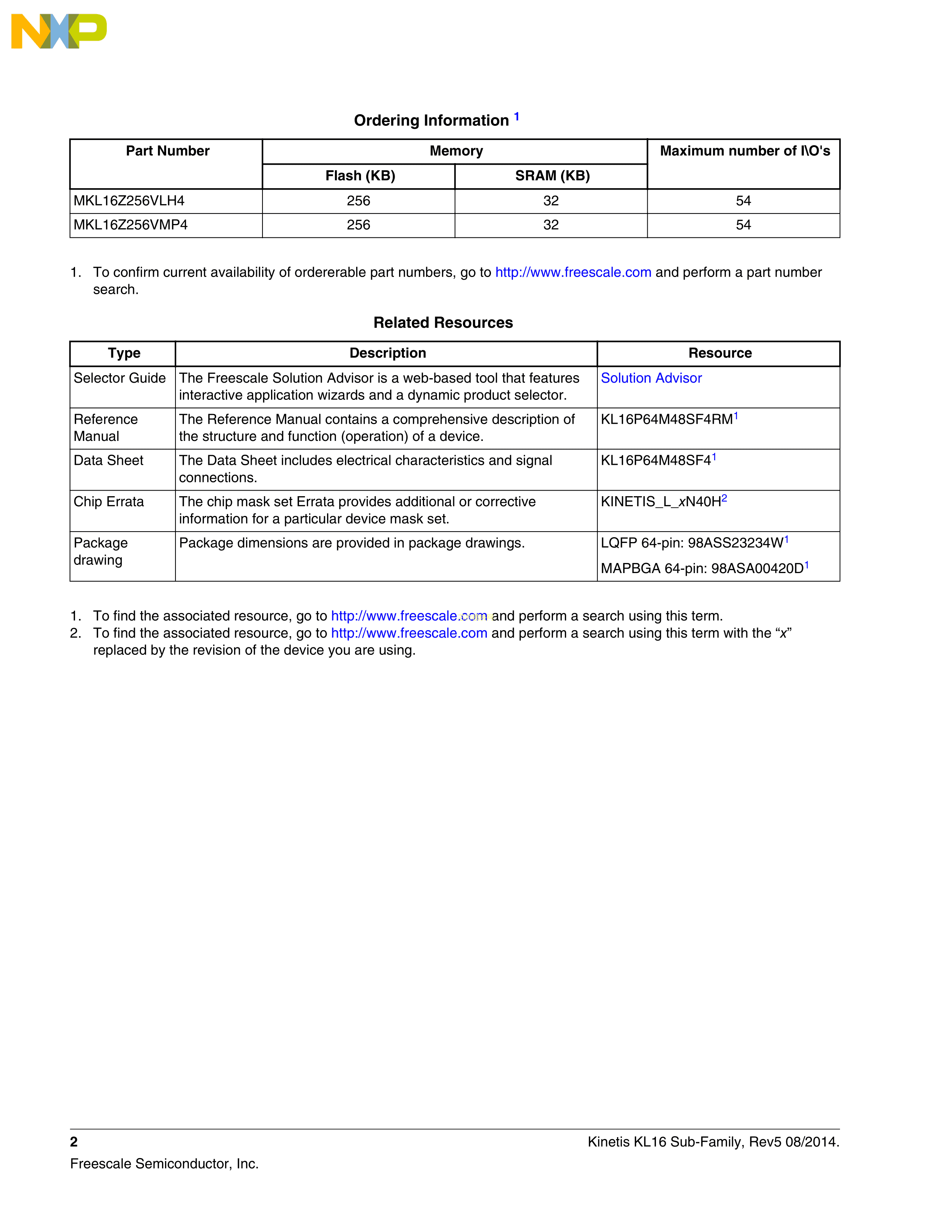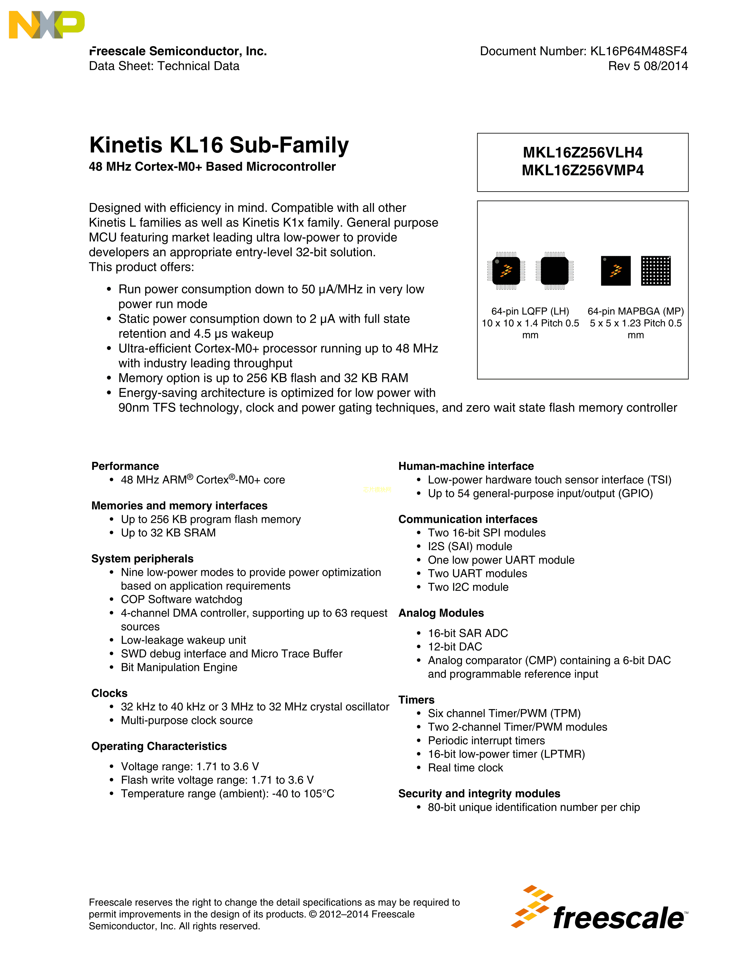 MKL16Z256VMP4数据手册MAPBGA-64(5x5)封装NXP(恩智浦)PDF规格书,中英