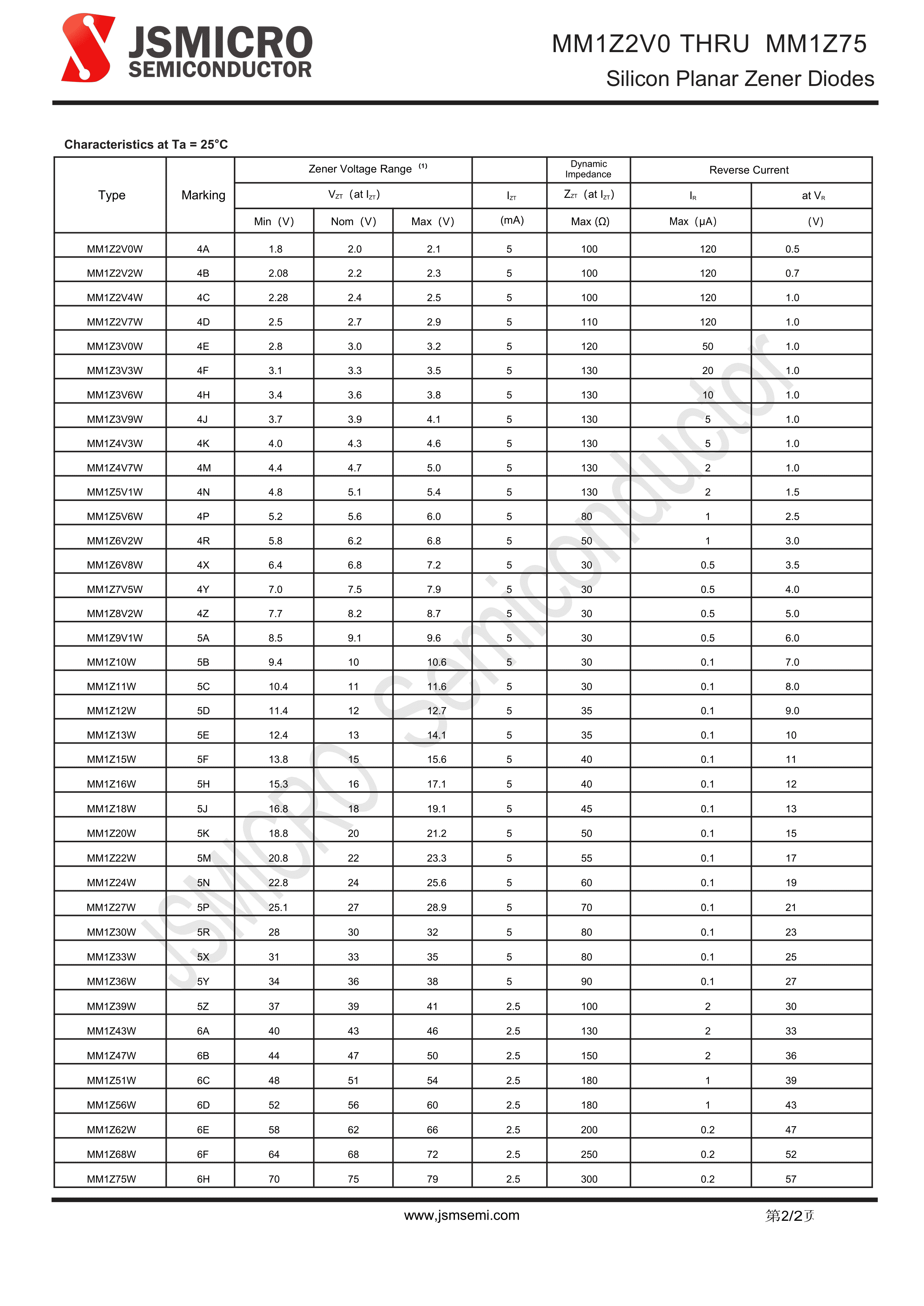 MM1Z2V7W数据手册SOD-123W封装JSMSEMI(杰盛微)PDF规格书,中英文下载