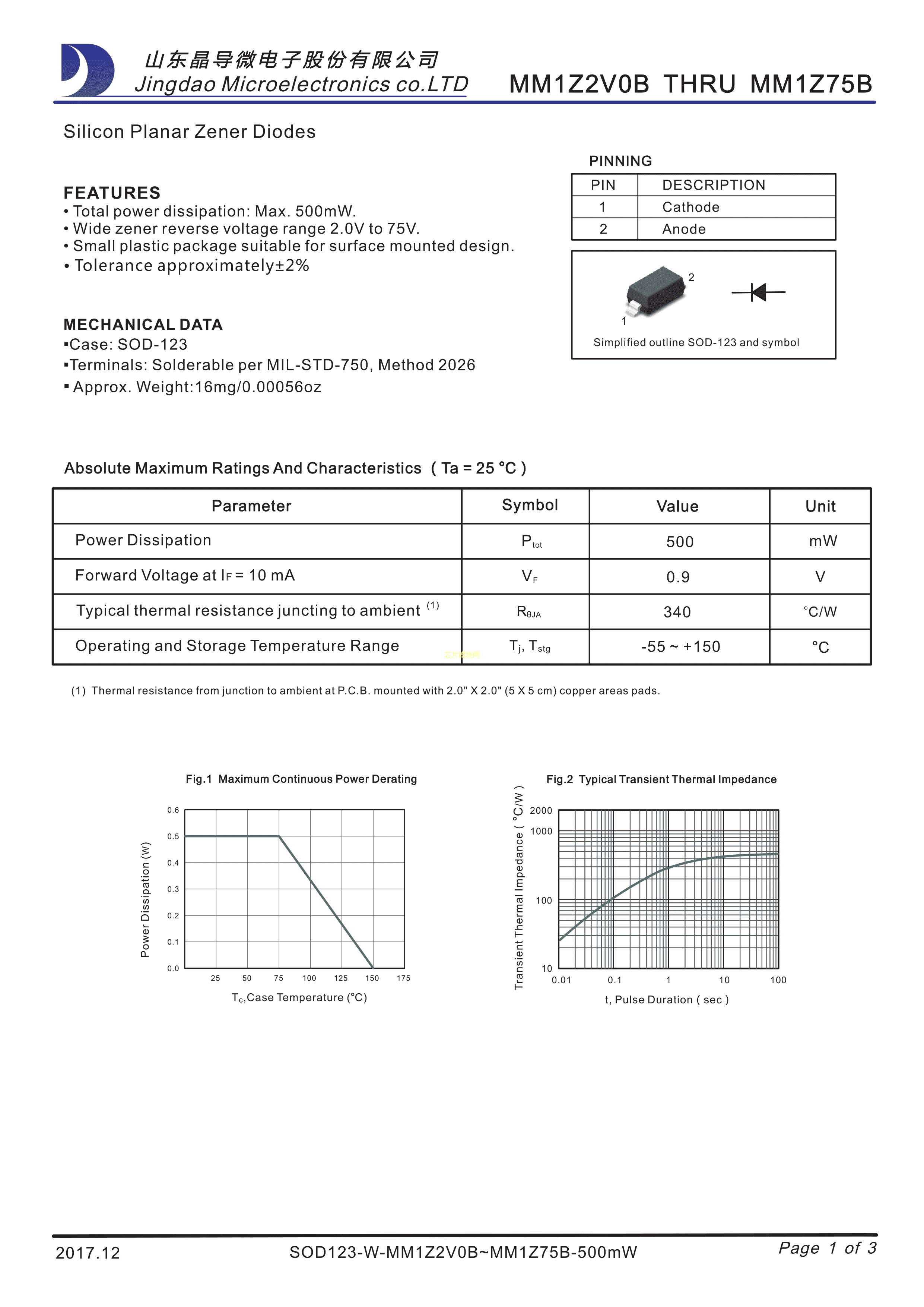 MM1Z5V6B数据手册SOD-123封装晶导微电子PDF规格书,中英文下载