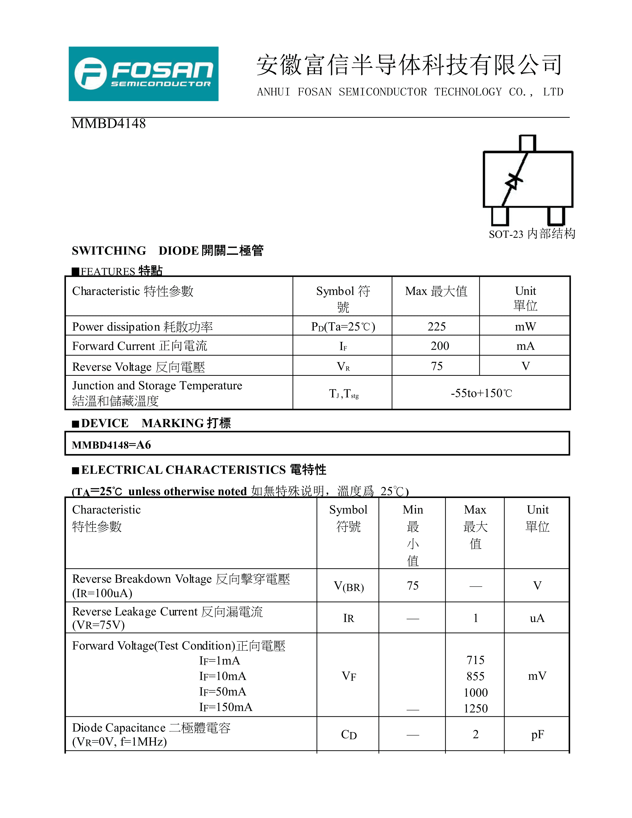 MMBD4148 KA2数据手册SOT-23封装FOSAN(富信)PDF规格书,中英文下载