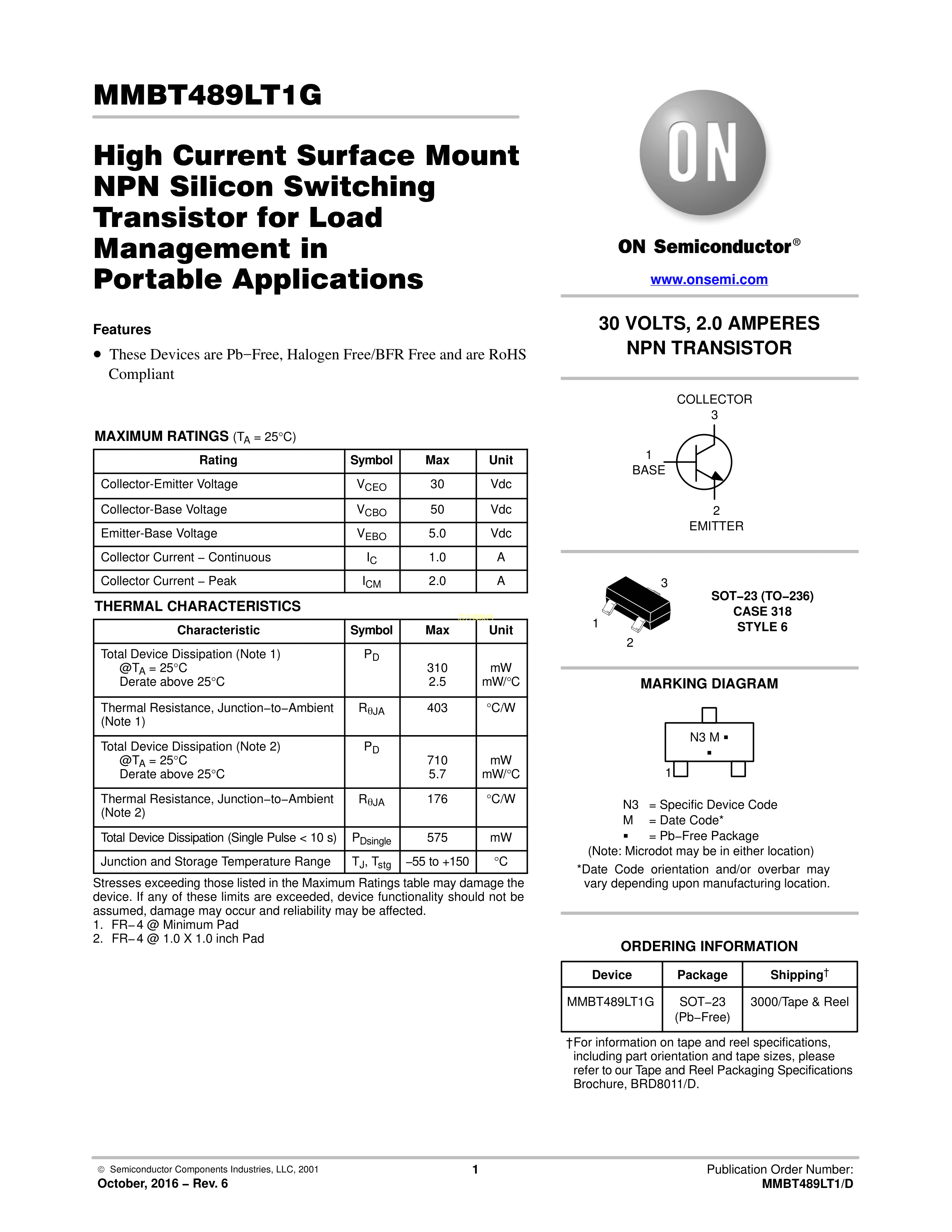 MMBT489LT1G数据手册SOT-23(SOT-23-3)封装onsemi(安森美)PDF规格书
