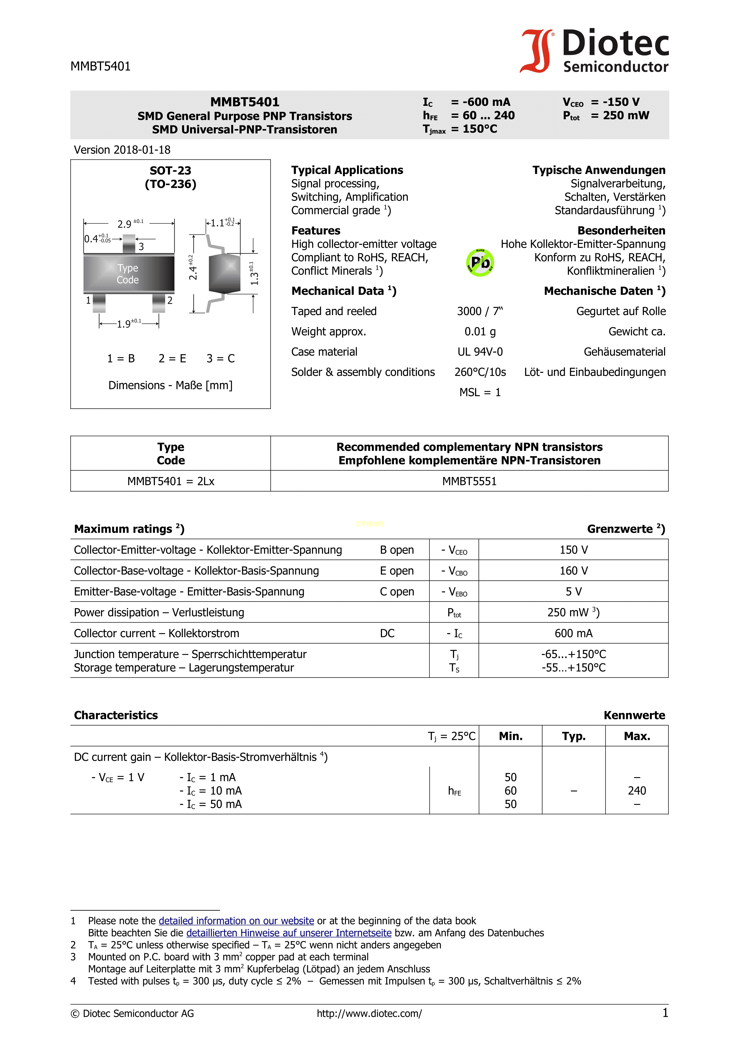 MMBT5401数据手册SOT-23(SOT-23-3)封装DIOTEC(德欧泰克)PDF规格书,中