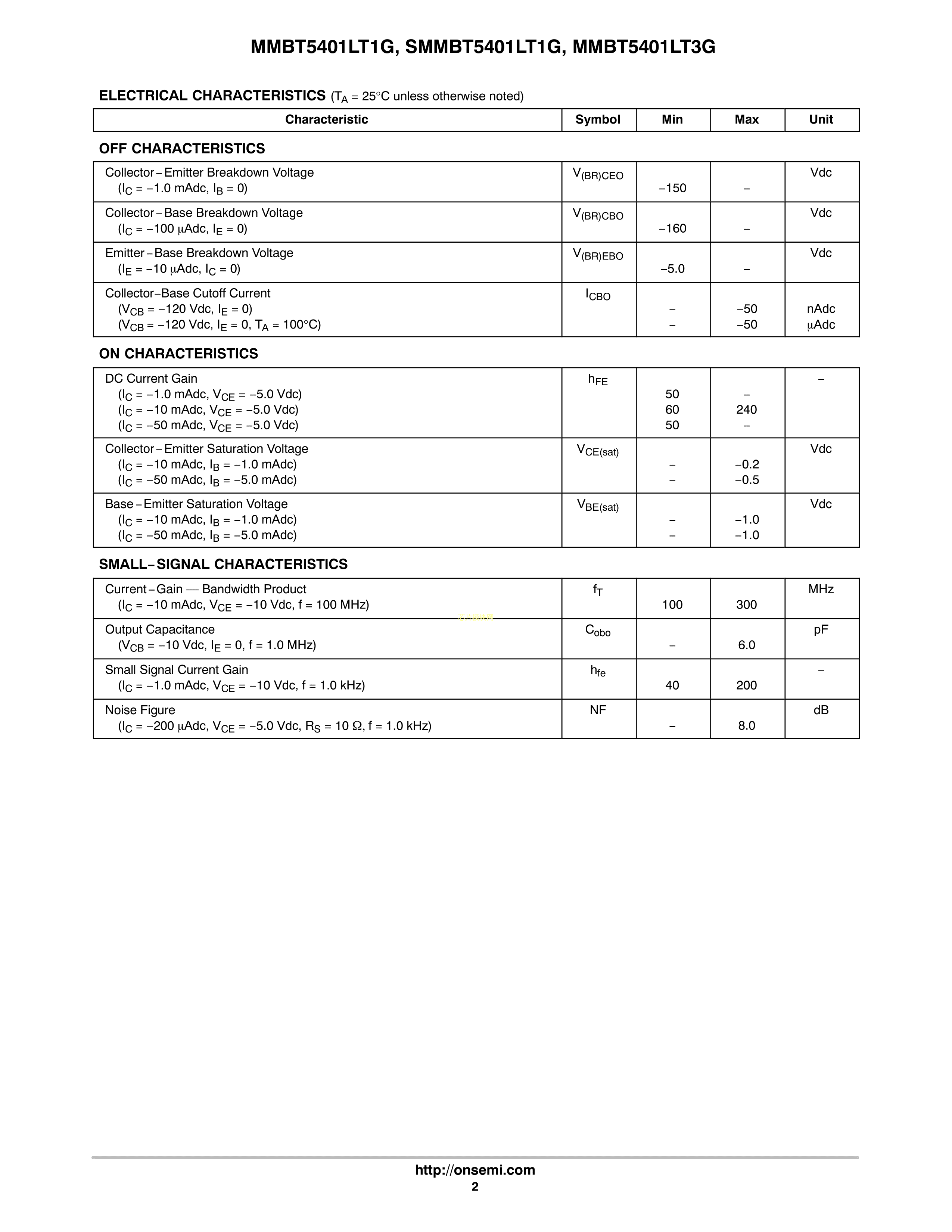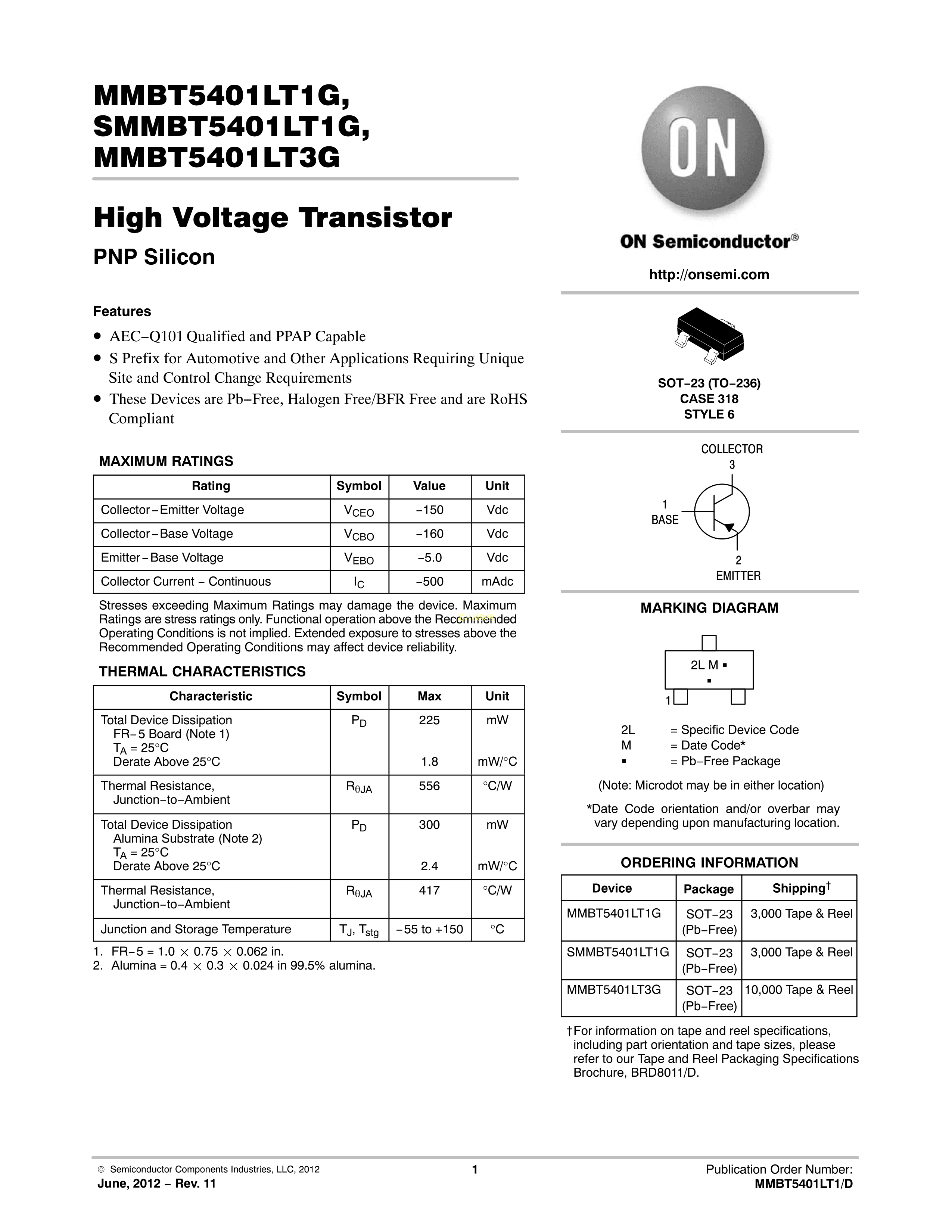 MMBT5401LT1G数据手册SOT-23(SOT-23-3)封装onsemi(安森美)PDF规格