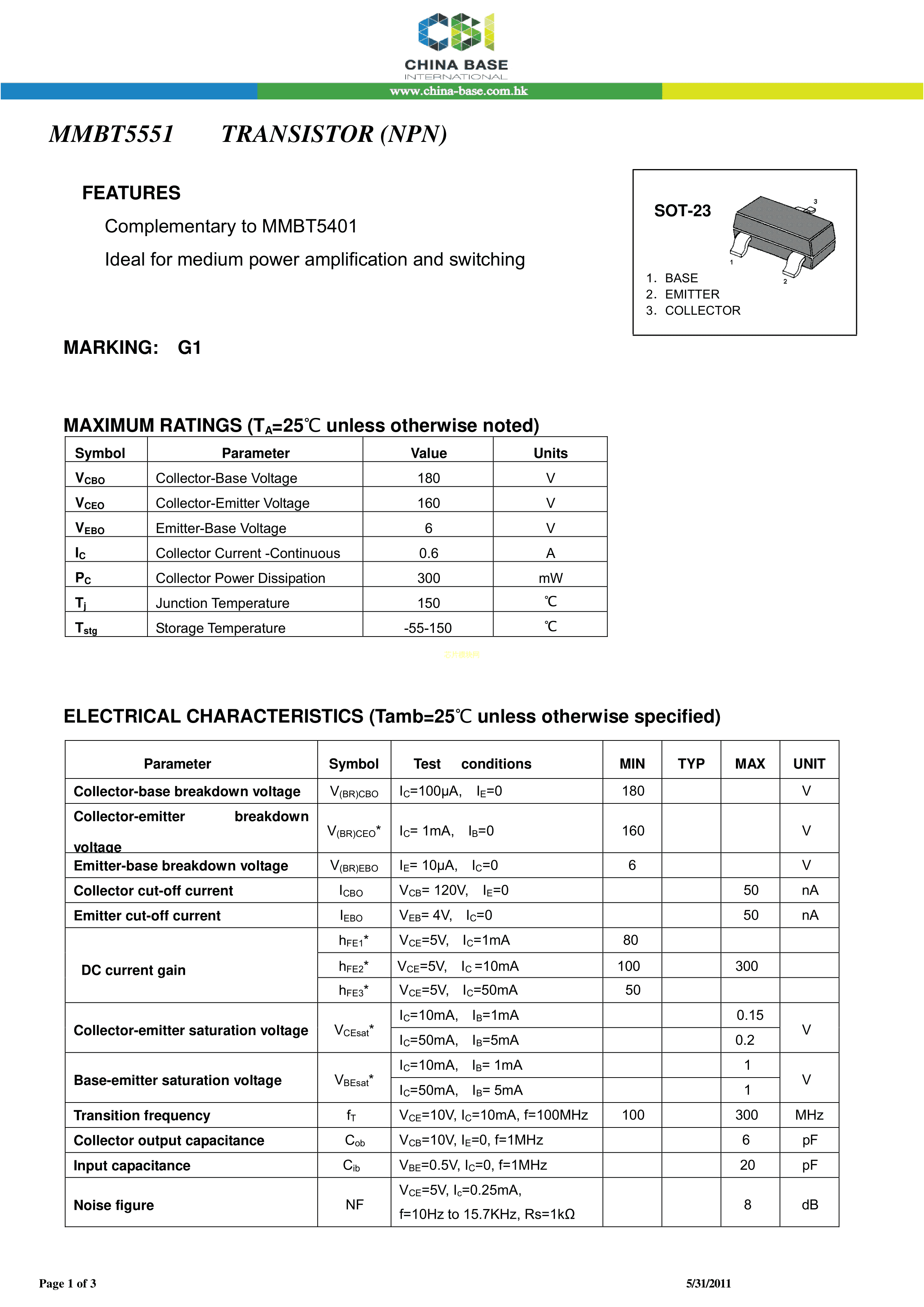 MMBT5551 G1数据手册SOT-23封装CBI(创基)PDF规格书,中英文下载
