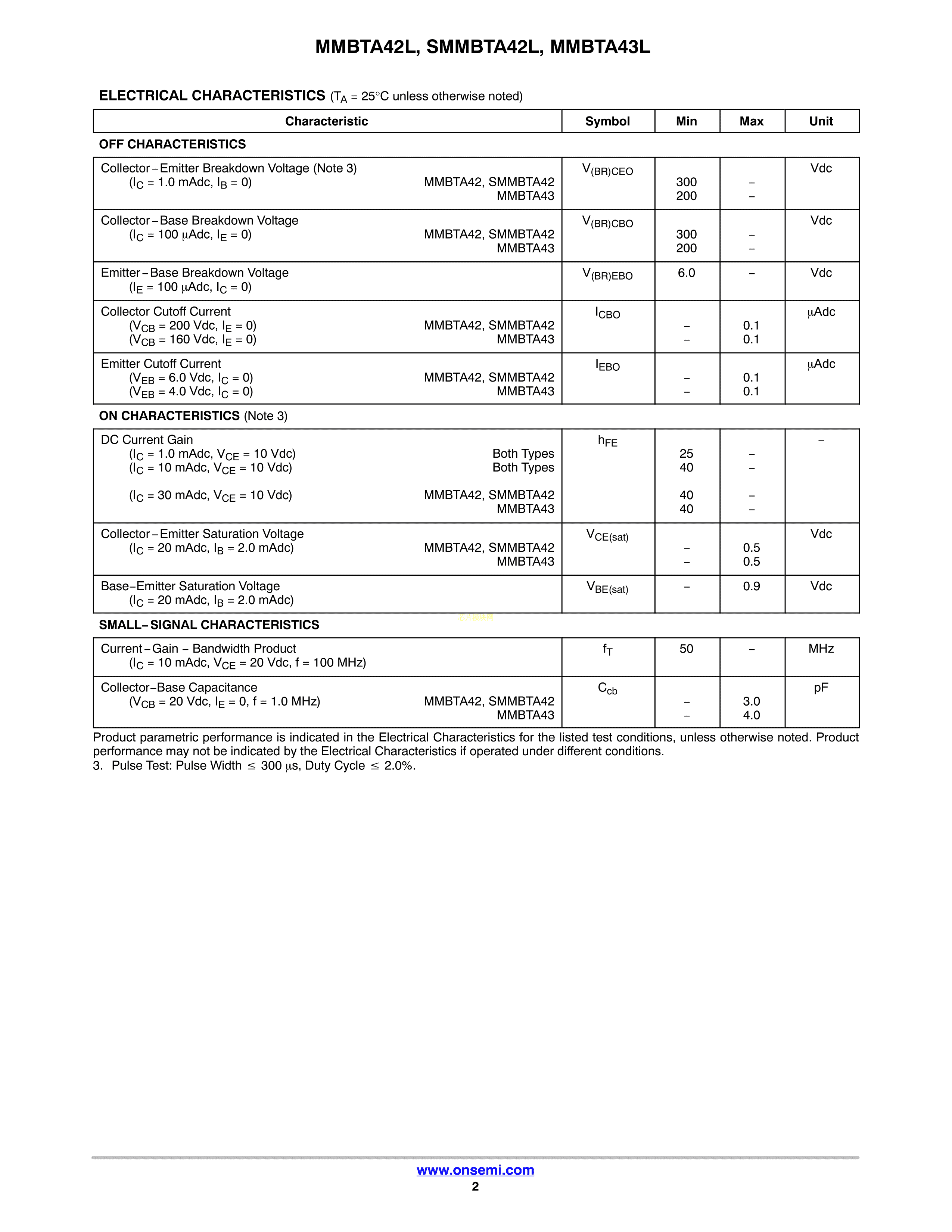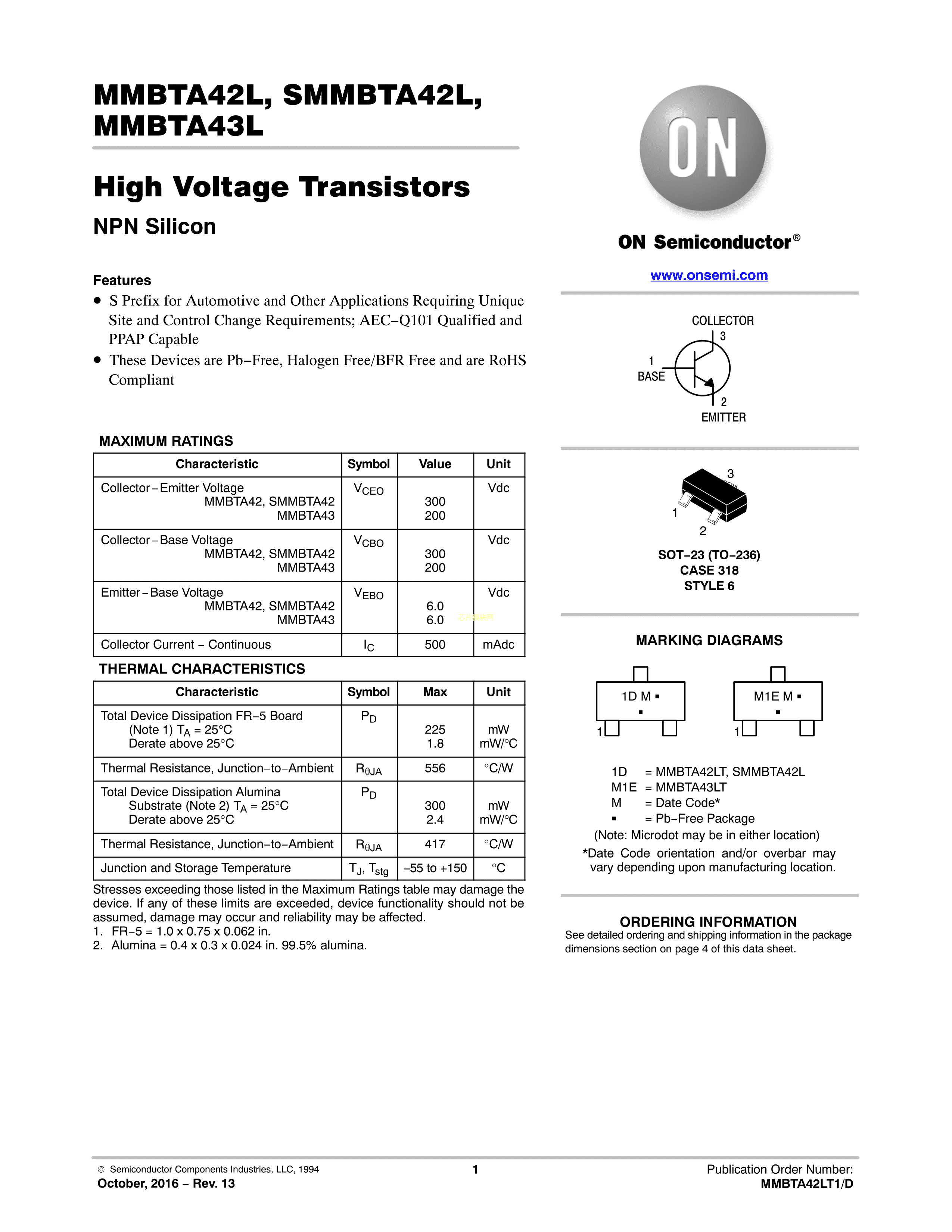 MMBTA42LT1G数据手册SOT-23(SOT-23-3)封装onsemi(安森美)PDF规格书