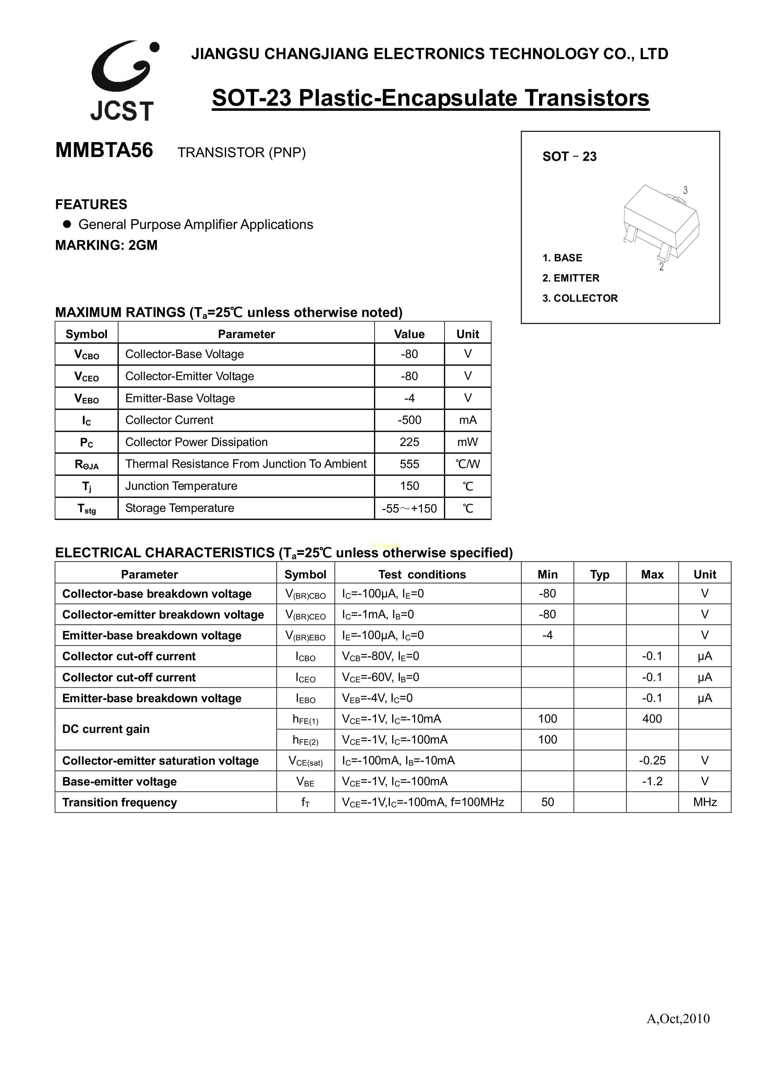 MMBTA56数据手册SOT-23(SOT-23-3)封装CJ(江苏长电-长晶)PDF规格书,中英文