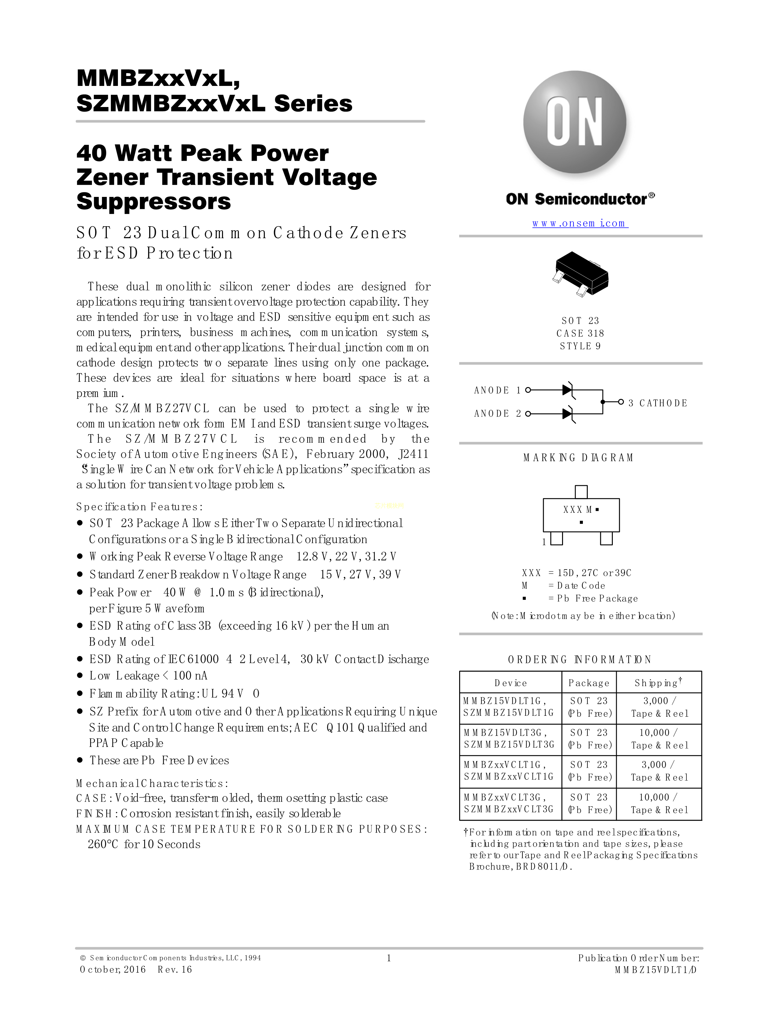 MMBZ27VCLT1G数据手册SOT-23(SOT-23-3)封装onsemi(安森美)PDF规格