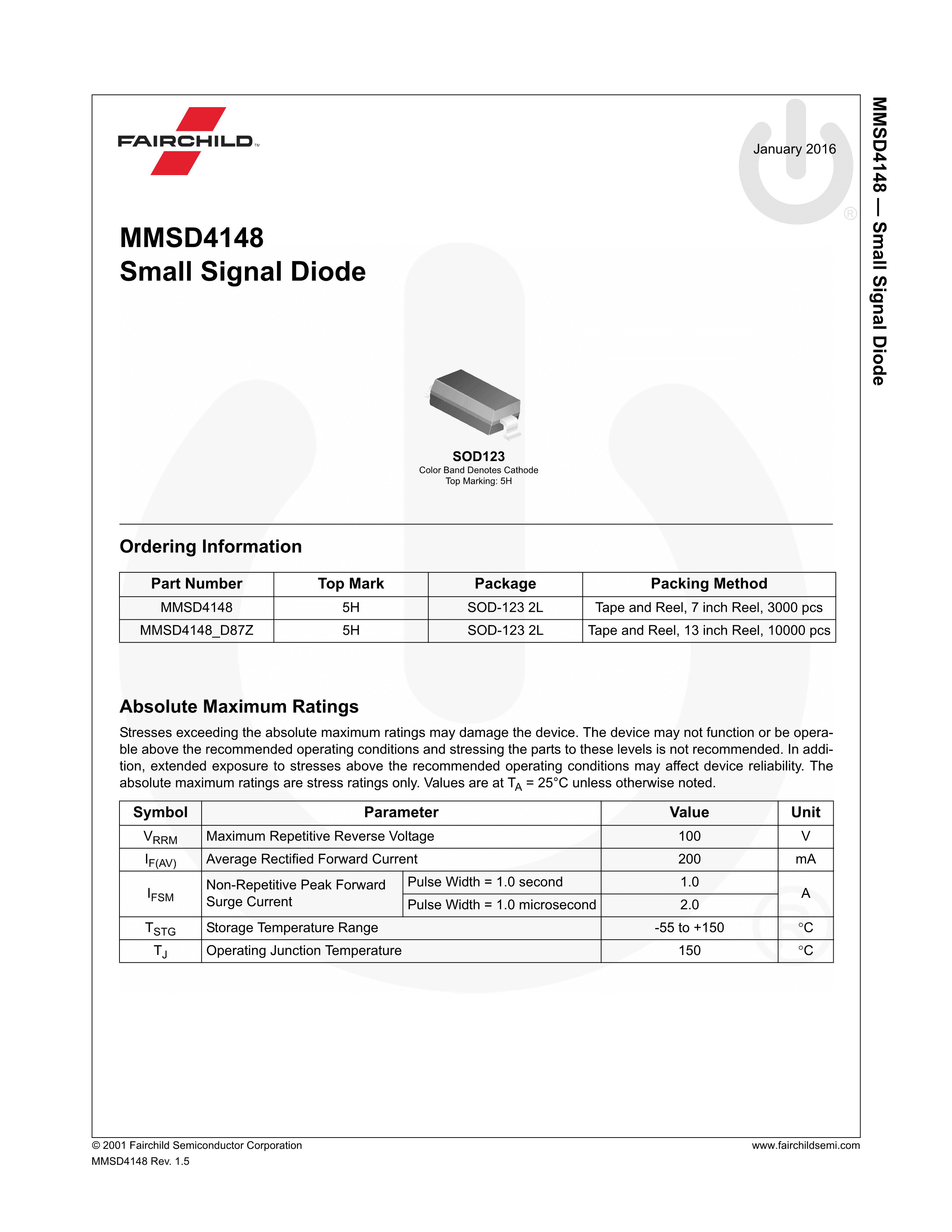 MMSD4148数据手册SOD-123封装onsemi(安森美)PDF规格书,中英文下载
