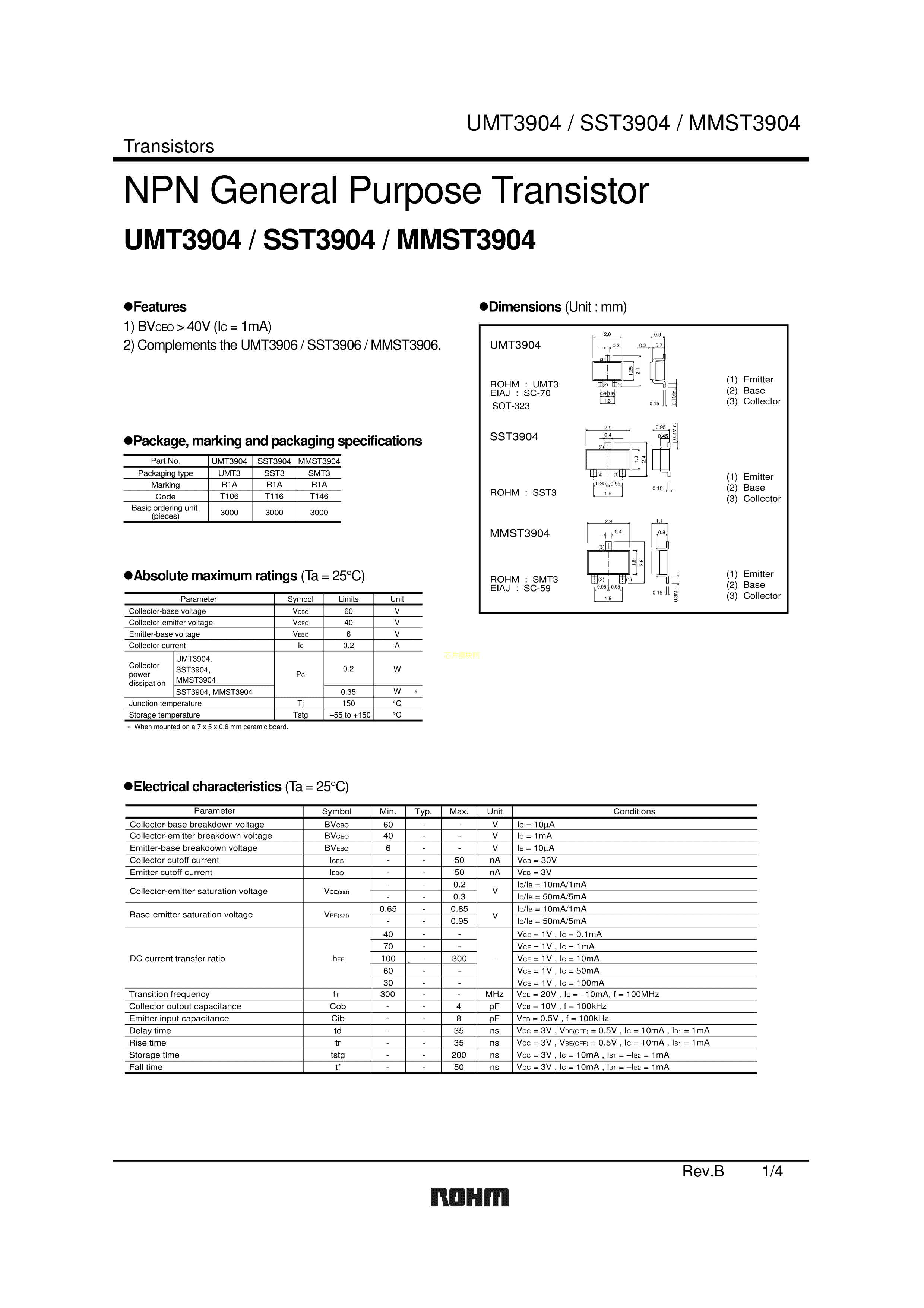 MMST3904T146数据手册SOT-23-3L封装ROHM(罗姆)PDF规格书,中英文下载