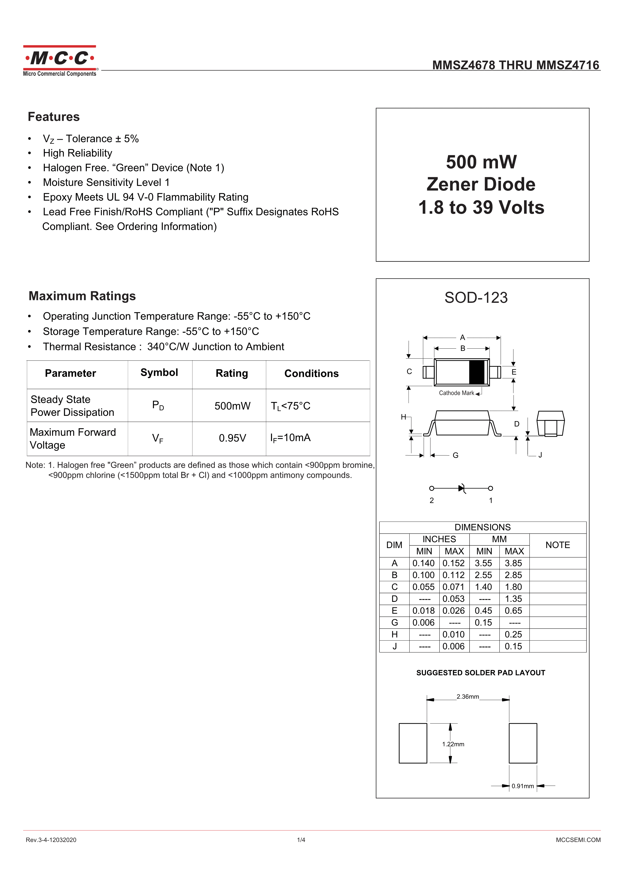 MMSZ4708-TP数据手册SOD-123封装MCC(美微科)PDF规格书,中英文下载