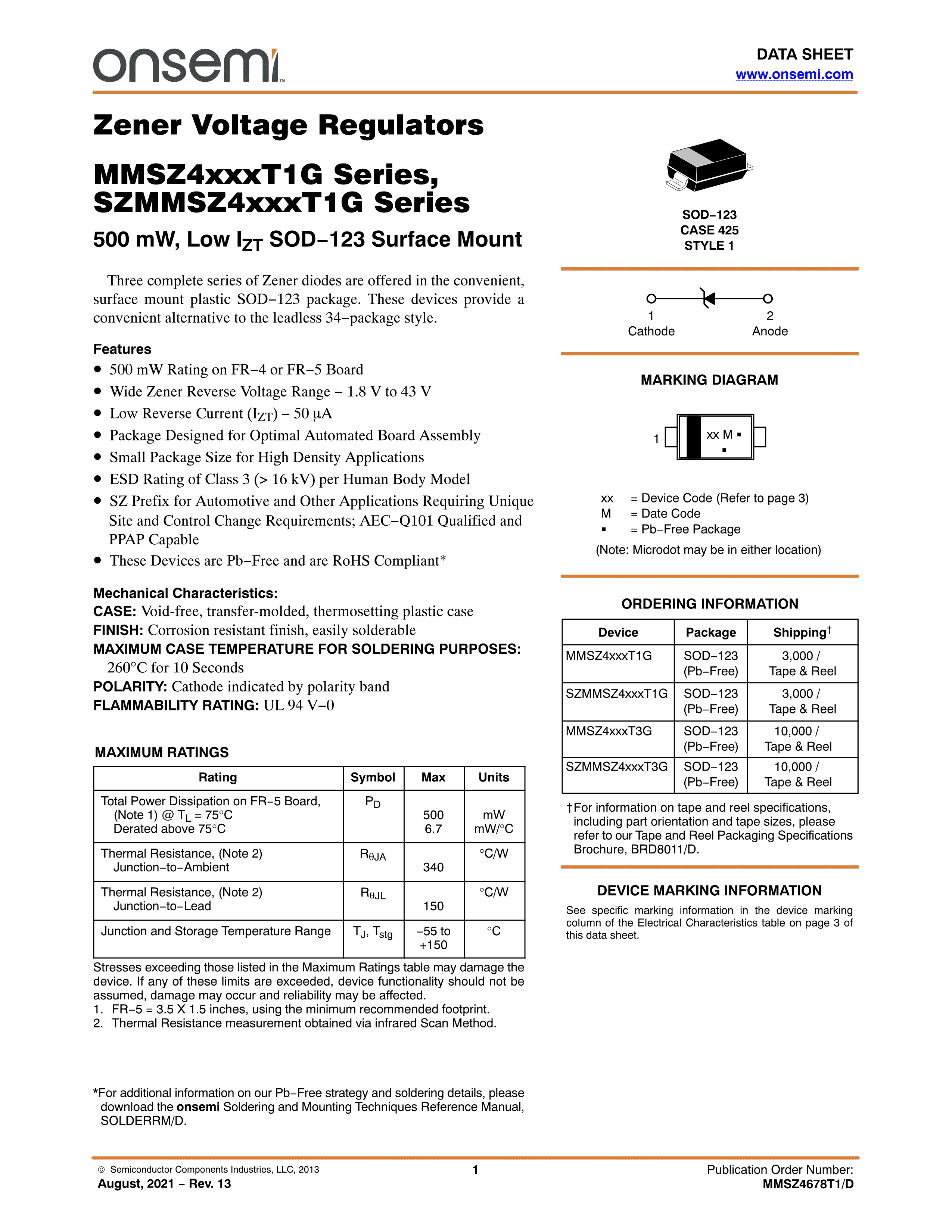 MMSZ4708T1G数据手册SOD-123封装onsemi(安森美)PDF规格书,中英文下载