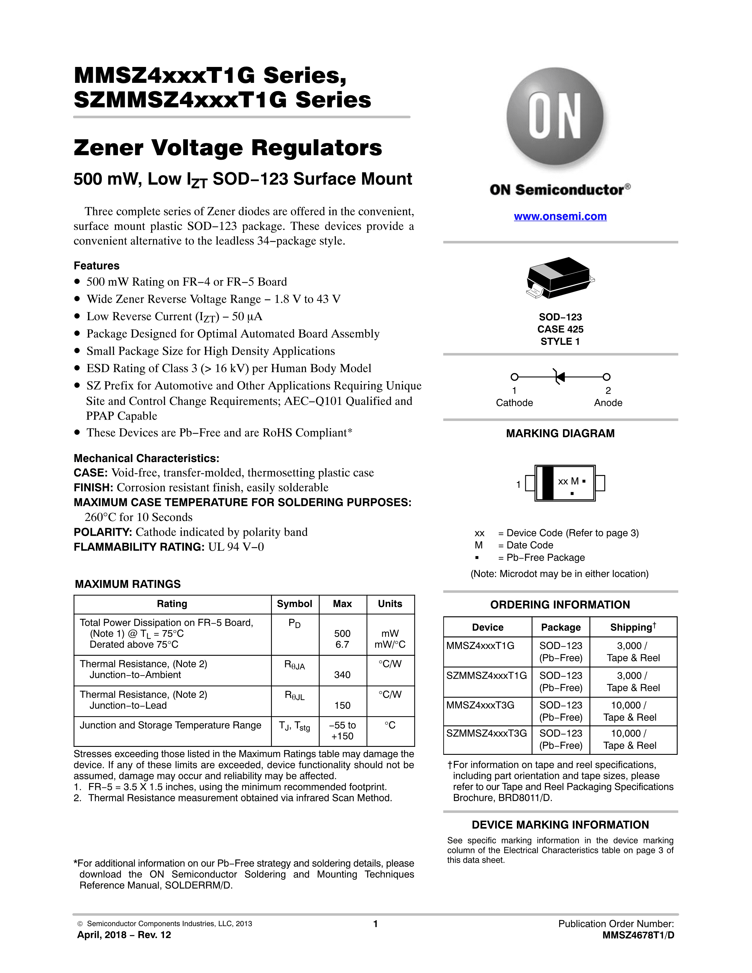 MMSZ4709T1G数据手册SOD-123封装onsemi(安森美)PDF规格书,中英文下载