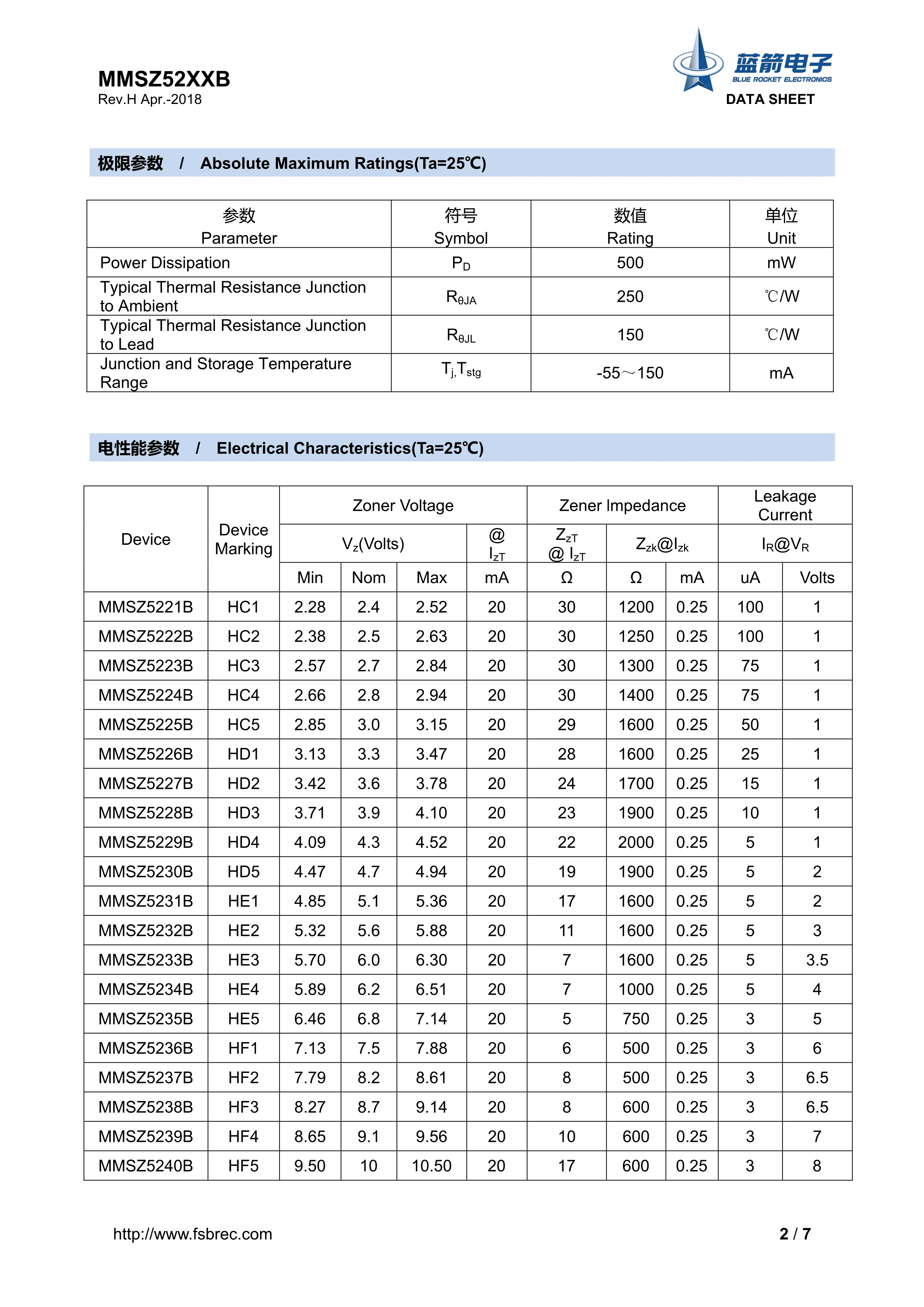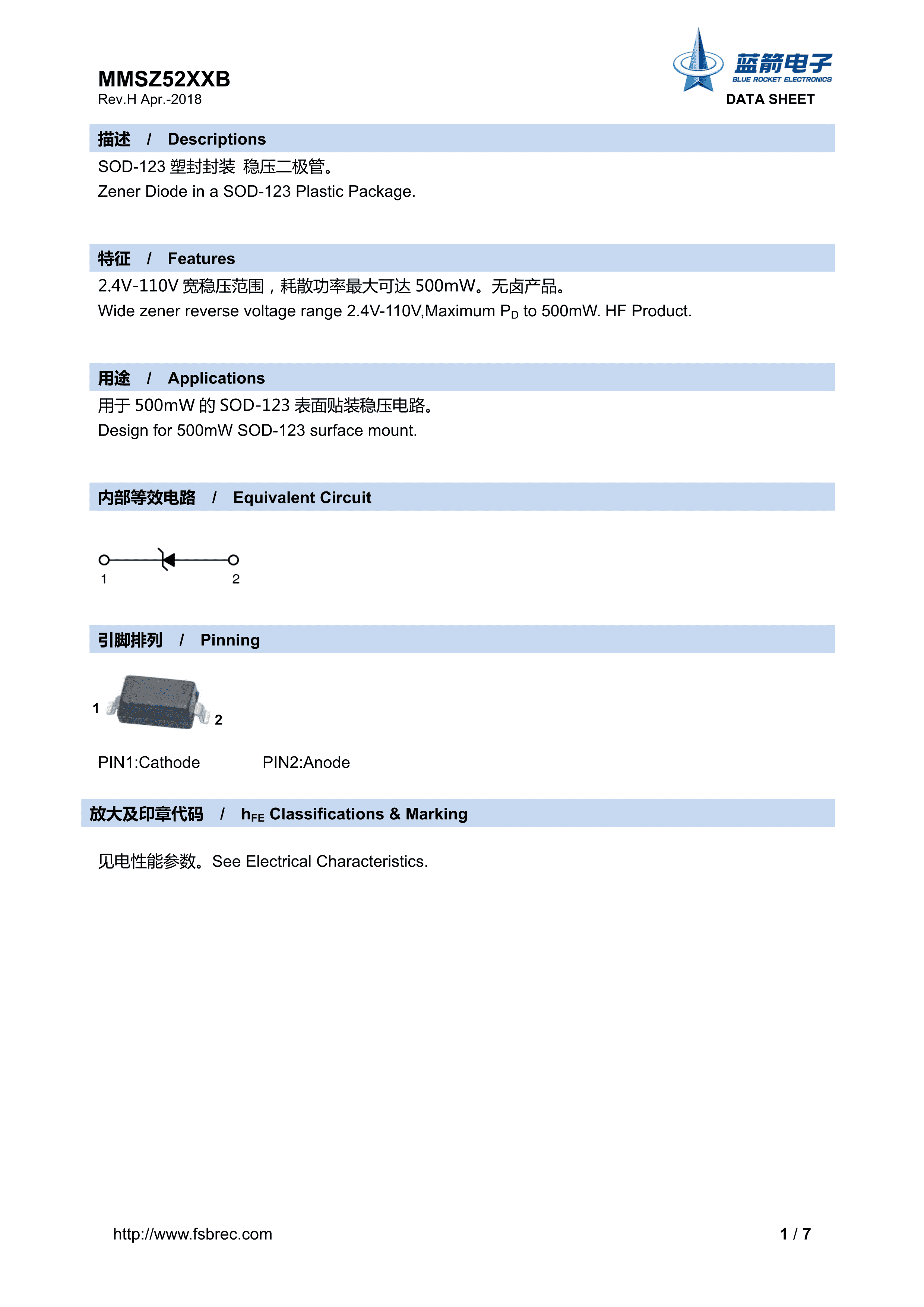 MMSZ5234B数据手册SOD-123封装BLUE ROCKET(蓝箭)PDF规格书,中英文下载
