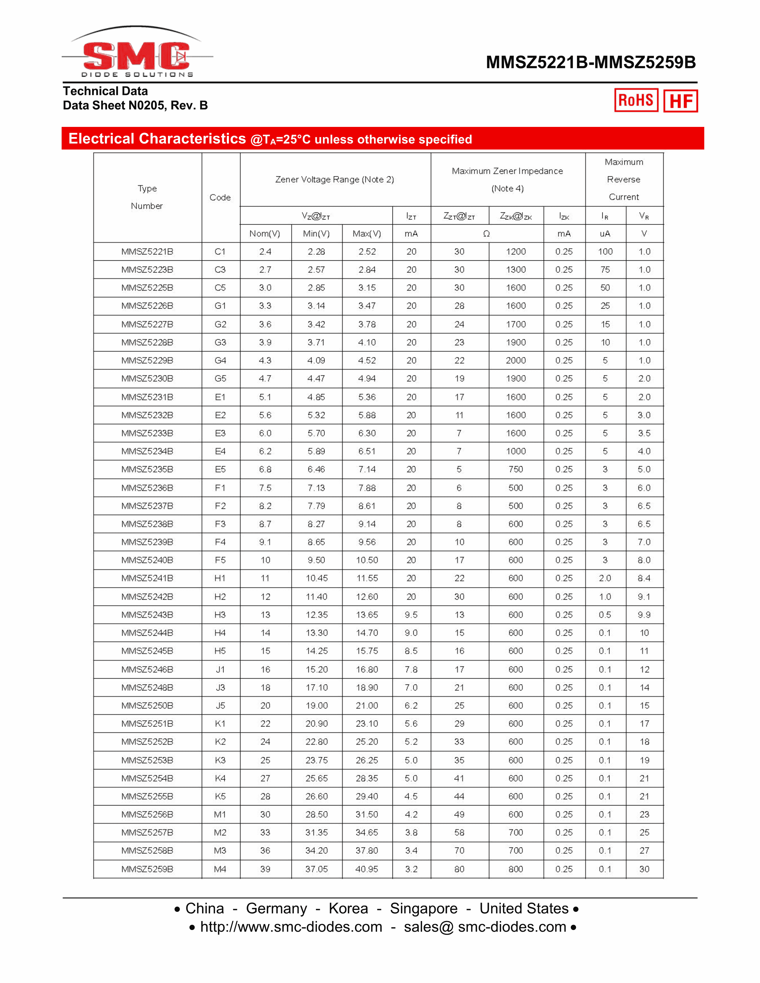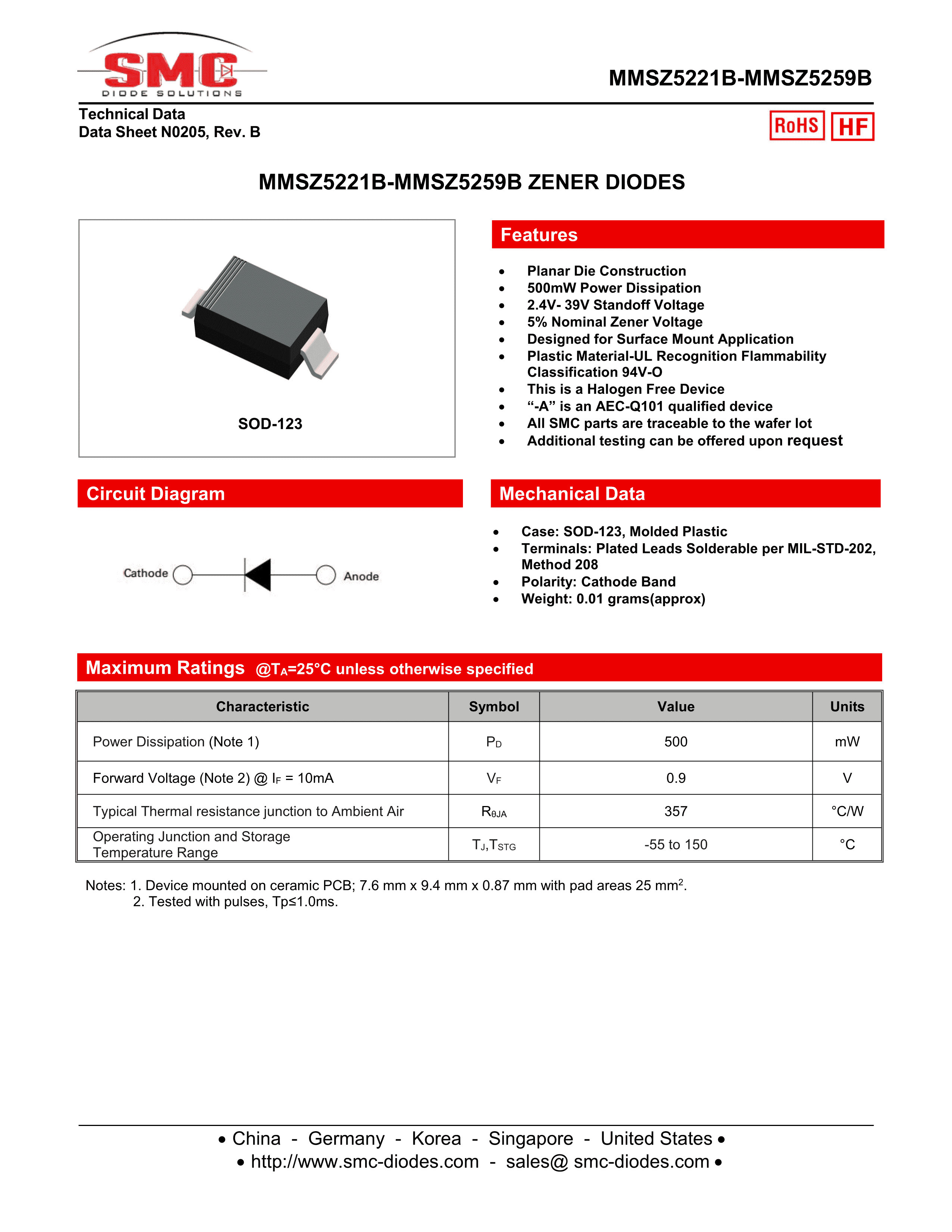 MMSZ5254B数据手册SOD-123封装SMC(桑德斯)PDF规格书,中英文下载