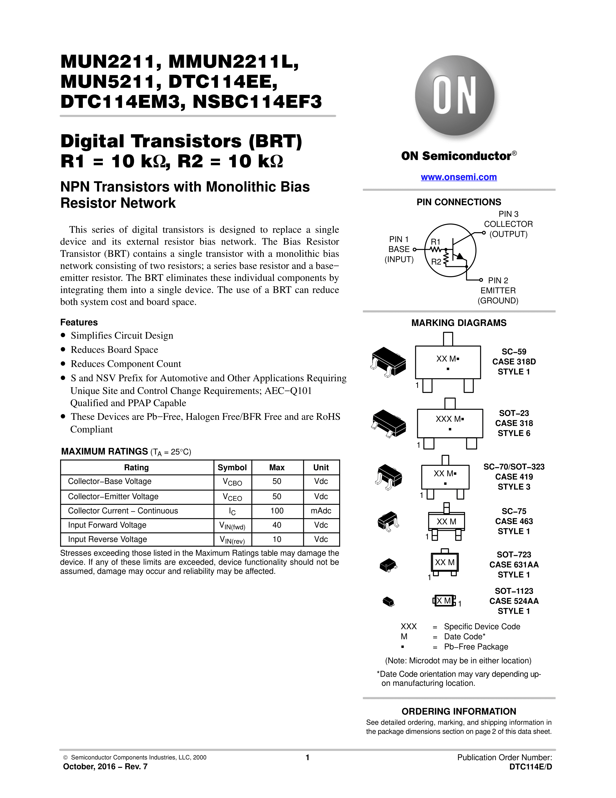 MMUN2211LT3G数据手册SOT-23(SOT-23-3)封装onsemi(安森美)PDF规格